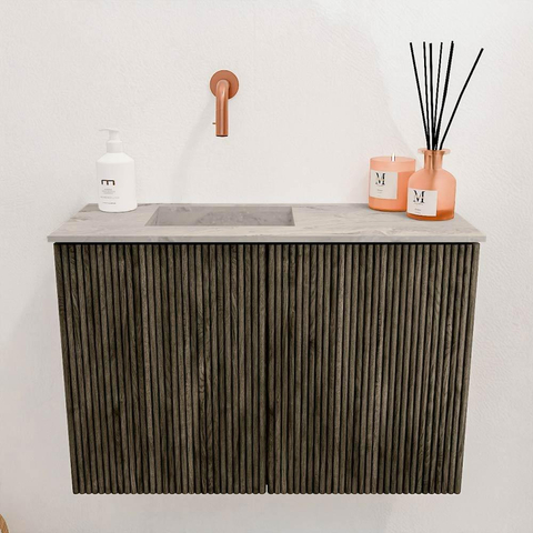 Avec ce magnifique meuble, vous donnez immédiatement à votre salle de bains ou toilette d'invités un aspect élégant et chaleureux. Il combine un design moderne avec des matériaux naturels, ce qui le rend non seulement pratique, mais aussi un véritable point focal. Grâce à la couleur subtile Shadow et à la structure verticale nervurée élégante, l'espace acquiert une ambiance raffinée qui invite à la détente. La vasque de couleur Glace avec la position du trou de robinet à gauche complète l'ensemble et apporte une touche fraîche et lumineuse. Ce meuble est conçu avec un souci du détail et de la facilité d'utilisation, afin que vous puissiez profiter pleinement d'une salle de bains ordonnée et fonctionnelle. Que vous souhaitiez égayer un petit espace ou ajouter une touche supplémentaire de luxe, ce meuble offre l'équilibre parfait entre design et confort.
