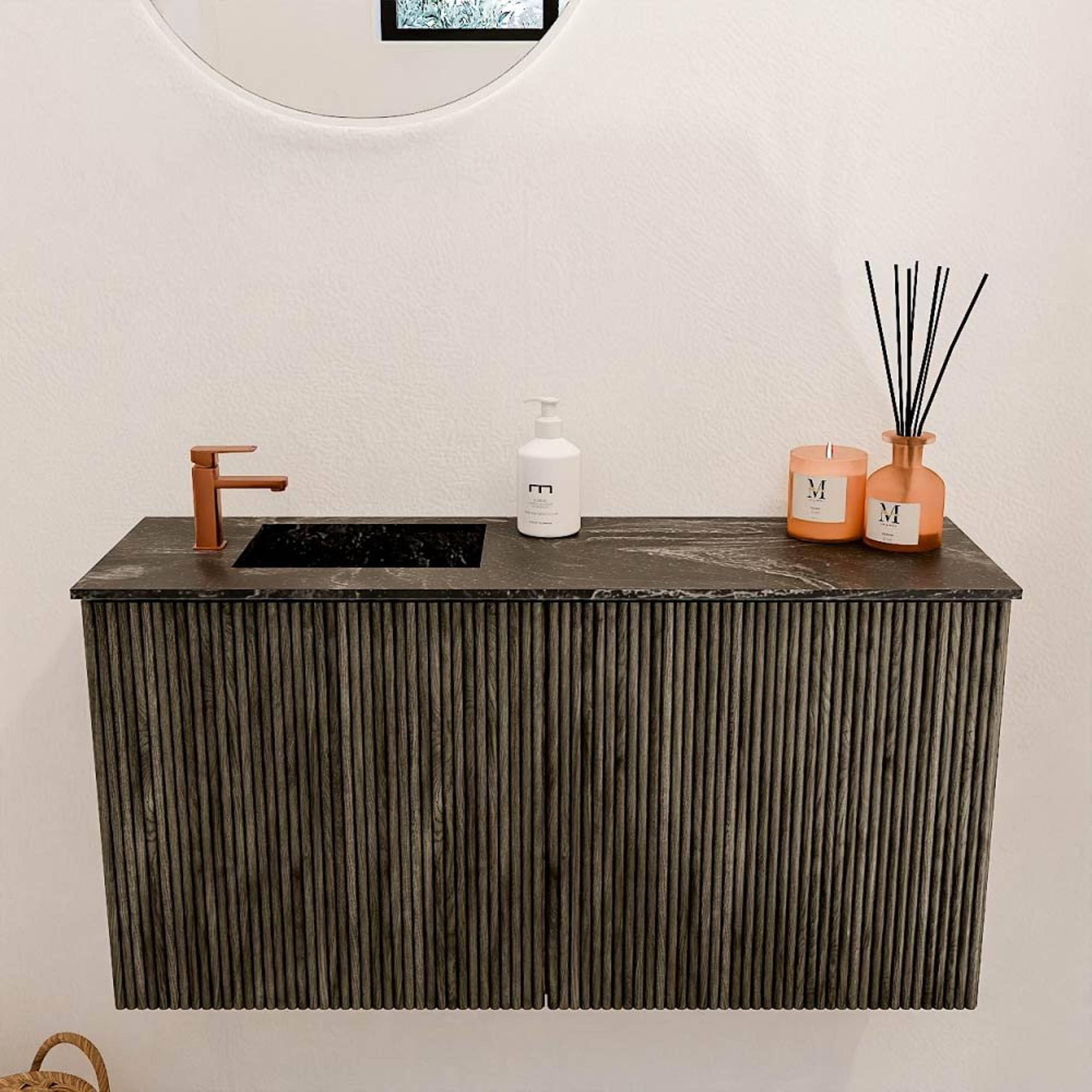 La combinaison de chêne massif et de placage de chêne dans la couleur Shadow fait de ce meuble une pièce maîtresse intemporelle. Les rainures verticales donnent au meuble une texture subtile et une apparence élégante qui s'adapte facilement à différents styles de salle de bains. Que vous optiez pour un aménagement moderne, campagnard ou industriel, ce meuble ajoute toujours une touche chaleureuse et naturelle. La vasque de couleur Lava forme un joli contraste et crée un ensemble ludique mais harmonieux. Ainsi, vous créez une salle de bains qui n'est pas seulement fonctionnelle, mais qui invite aussi à la détente et au plaisir.