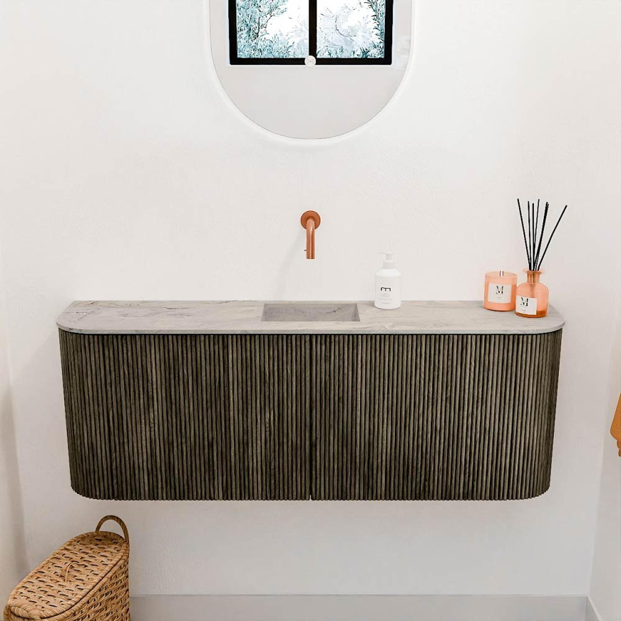 La combinaison de la couleur profonde Shadow et du Glace clair de la vasque crée un aspect raffiné qui attire immédiatement l'attention. Les rainures verticales sur la façade donnent au meuble une touche contemporaine, tandis que les formes arrondies des deux côtés rendent l'ensemble plus doux et accueillant. Ce meuble est un véritable point fort qui apporte une atmosphère luxueuse et chaleureuse à votre salle de bains. Grâce à l'utilisation de matériaux de haute qualité et à un design réfléchi, le meuble dégage une classe sans dominer. Vous créez ainsi une salle de bains à la fois moderne et invitante.