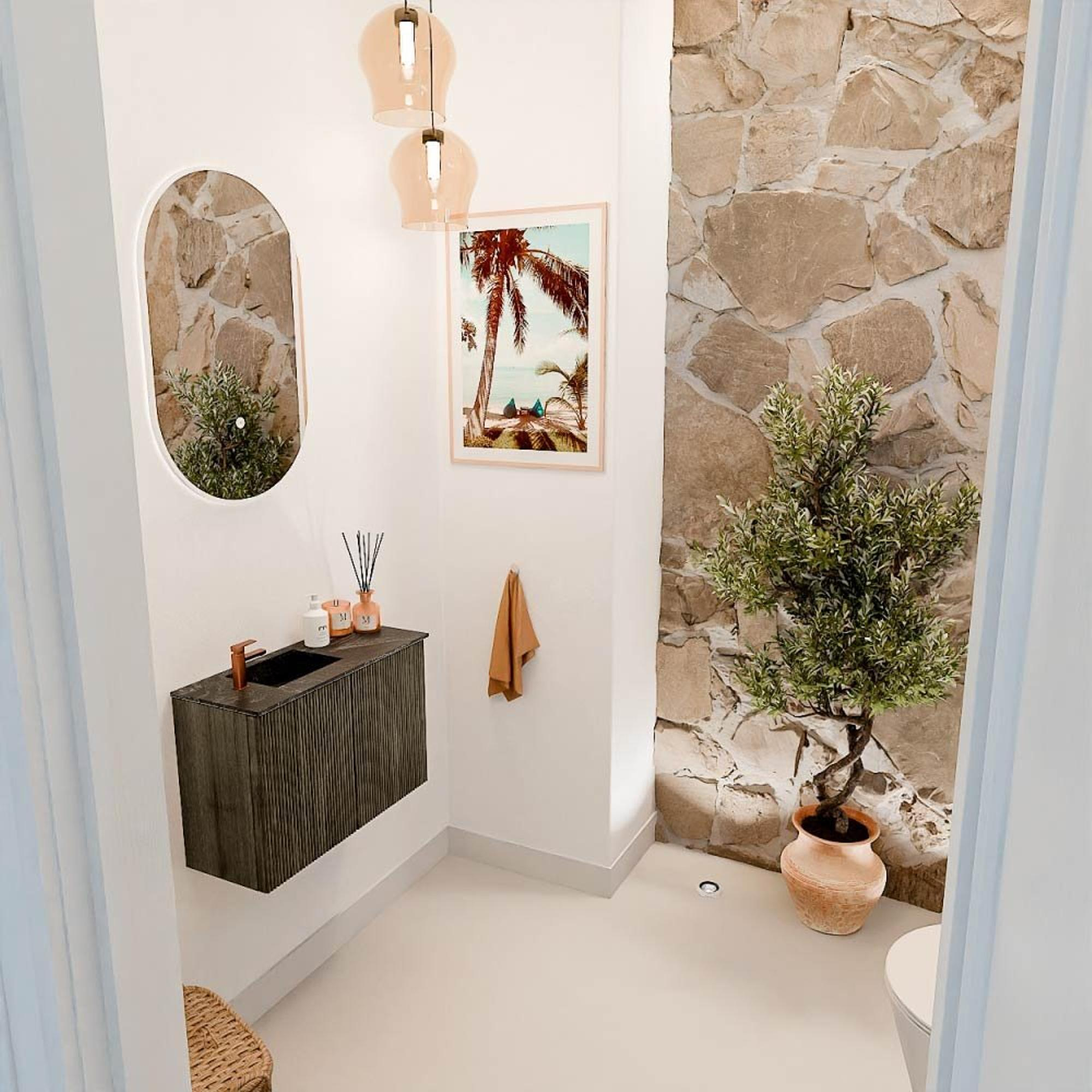 La combinaison de chêne massif et de la couleur profonde Shadow confère à ce meuble une apparence raffinée et exclusive. Les rainures verticales ajoutent un détail subtil qui donne un petit plus au design. Cela fait que le meuble n'est pas seulement fonctionnel, mais aussi un véritable point focal dans votre salle de bains. Grâce au style intemporel, il s'adapte aisément aux intérieurs modernes comme classiques. Vous profitez ainsi pendant des années d'une salle de bains soignée et accueillante.