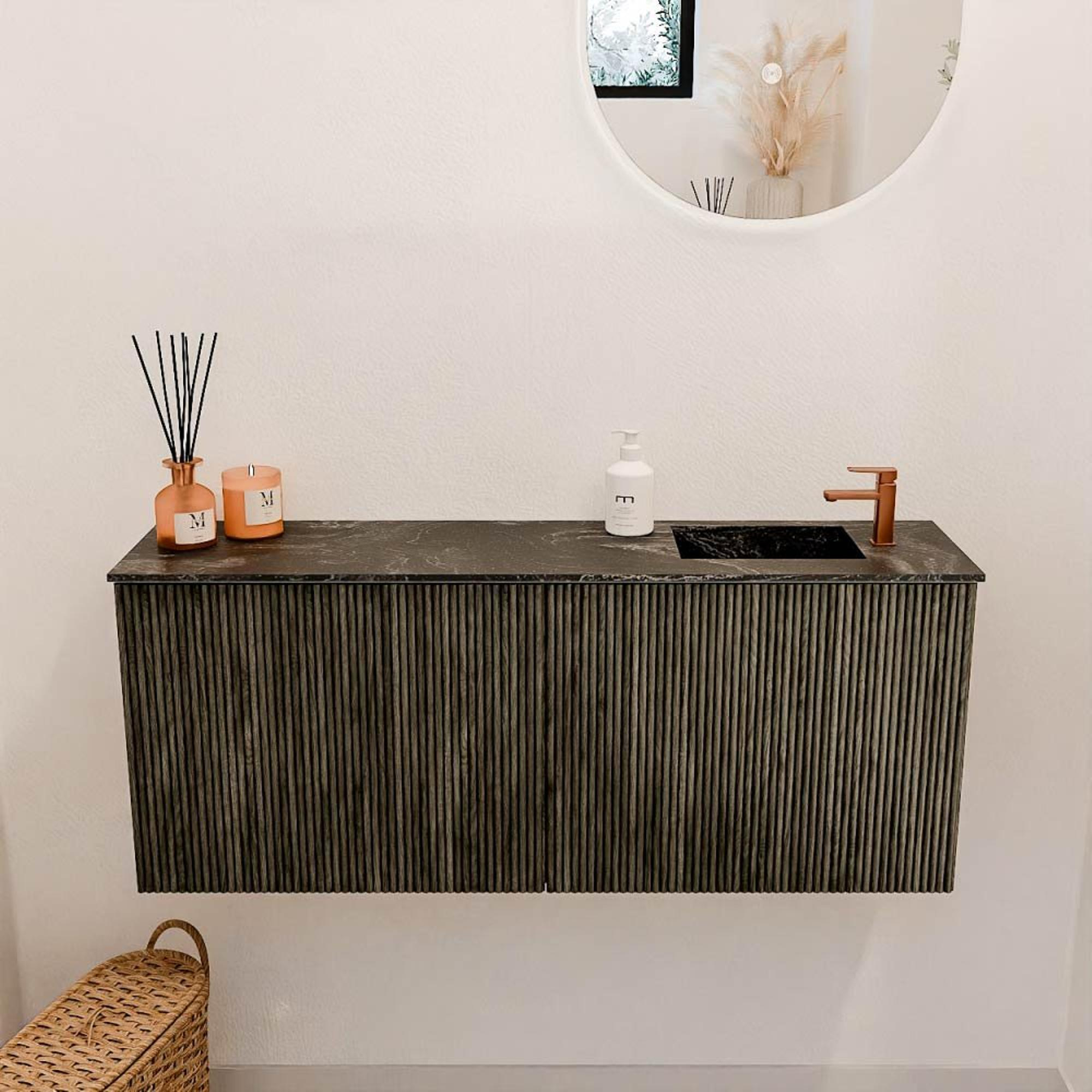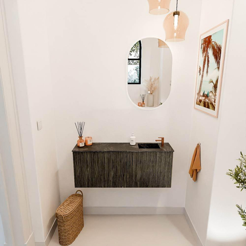 Imaginez comment votre salle de bains se transforme avec un meuble qui n'est pas seulement pratique, mais aussi un véritable point focal. Ce meuble ajoute immédiatement de l'ambiance et du style, grâce à son design raffiné avec des rainures verticales et l'aspect chaleureux et naturel du chêne. Il combine du chêne massif avec du placage de chêne, ce qui assure une finition robuste et pourtant élégante. La couleur subtile Shadow donne à l'ensemble un aspect moderne et intemporel, parfaitement adapté à différents styles de salle de bains. La vasque couleur lava avec un trou de robinet à droite complète l'ensemble et vous offre tout l'espace nécessaire pour effectuer votre routine quotidienne confortablement et avec style. Avec ce meuble, vous créez une salle de bains qui n'est pas seulement fonctionnelle, mais aussi un endroit où vous commencez et terminez chaque jour avec plaisir.