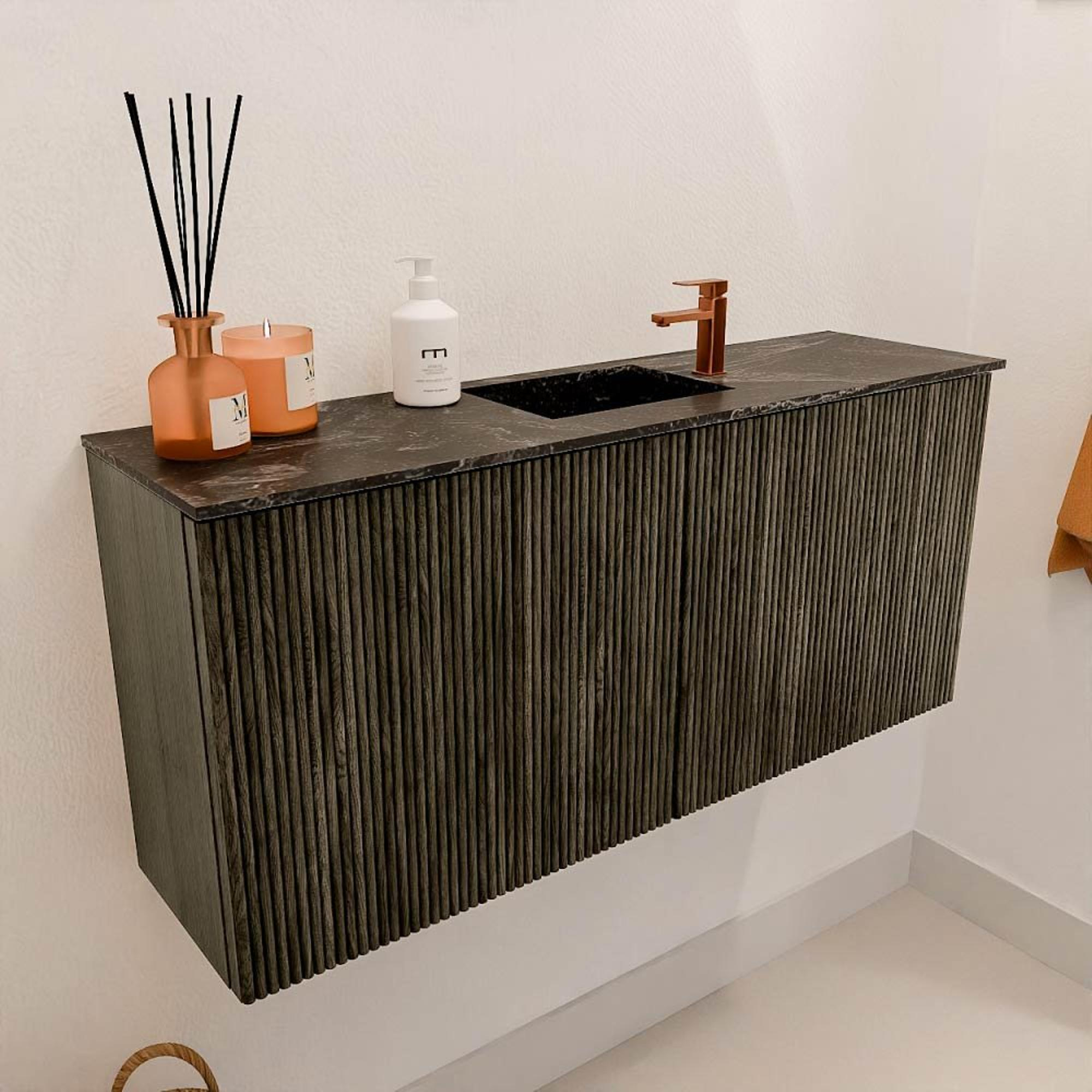 Le meuble est conçu avec une attention aux détails et une apparence intemporelle. La combinaison de chêne massif sur la façade et de placage chêne sur les côtés donne un aspect luxueux et naturel à l'ensemble. La couleur Shadow est subtile et pourtant pleine de caractère, faisant du meuble un véritable point focal sans dominer la pièce. Les rainures verticales ajoutent un élément ludique qui donne plus de profondeur au design. Ainsi, vous profitez d'un meuble de salle de bains qui est non seulement fonctionnel, mais aussi un ajout élégant à votre intérieur.