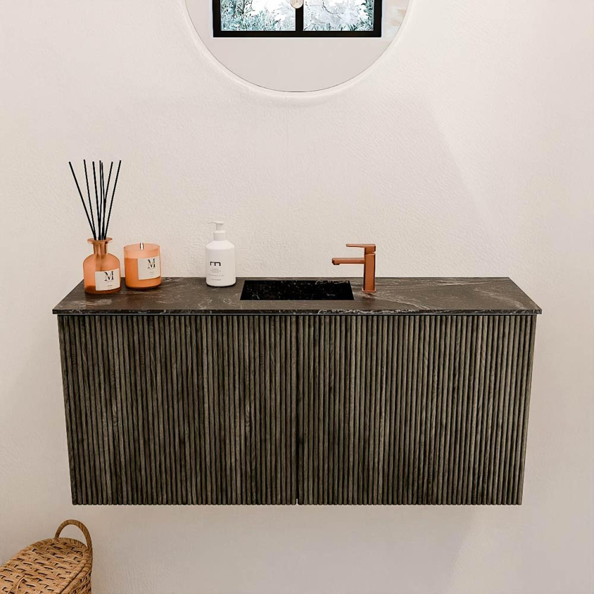 Avec ce magnifique meuble, vous donnez immédiatement à votre salle de bains un aspect élégant et chaleureux. Le design compact de 90 cm de large s'adapte parfaitement aussi bien aux petites qu'aux grandes salles de bains, sans compromettre l'espace de rangement ni le confort. Grâce à la couleur subtile Shadow et à l'utilisation de chêne massif, le meuble dégage une élégance naturelle, tandis que la vasque assortie en Lava offre un contraste audacieux. Les rainures verticales sur la façade apportent une touche raffinée et moderne qui s'harmonise facilement avec divers styles d'intérieur. Ce meuble rend votre routine quotidienne non seulement plus pratique, mais aussi plus agréable. Vous créez un endroit où fonctionnalité et design se rencontrent, transformant votre salle de bains en un espace apaisant et inspirant où vous commencez et terminez chaque jour avec plaisir.