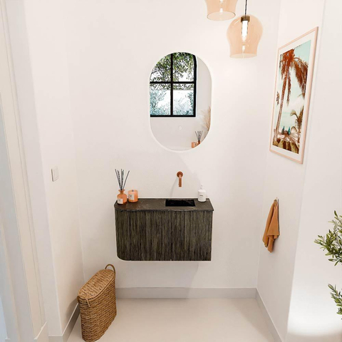 L'arrondi unique à gauche donne au meuble un caractère ludique et pourtant raffiné. La couleur Shadow est profonde et neutre, ce qui rend le meuble facile à combiner avec d'autres couleurs et matériaux dans votre salle de bains. La vasque de couleur Lava ajoute une touche chaude et naturelle qui équilibre l'ensemble. Ce meuble est conçu avec un souci du détail et de l'esthétique, de sorte qu'il n'est pas seulement fonctionnel, mais contribue aussi réellement à l'ambiance et à l'apparence de votre salle de bains. Ainsi, vous créez un espace qui invite à la détente et à un usage quotidien.