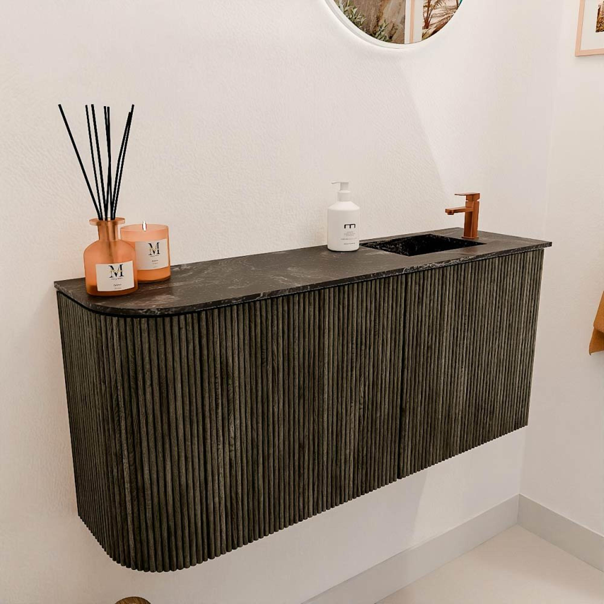 Avec ce magnifique meuble, vous donnez immédiatement à votre salle de bains une mise à jour élégante et moderne. Il combine une apparence raffinée avec une fonctionnalité intelligente, rendant votre salle de bains non seulement plus belle, mais aussi plus pratique. L'arrondi subtil sur le côté gauche crée un design ludique et unique, tandis que la couleur chaude Shadow crée une atmosphère calme et élégante. La vasque fournie en Lava ajoute un accent robuste, parfaitement positionnée à droite avec un trou de robinet pour votre robinet préféré. Grâce aux matériaux de haute qualité et à la conception réfléchie, vous profitez d'un meuble durable qui donne à votre salle de bains une apparence luxueuse. Que vous planifiez une rénovation complète ou que vous cherchiez simplement un élément accrocheur, ce meuble fait la différence et invite à des moments de détente dans une salle de bains qui vous correspond entièrement.