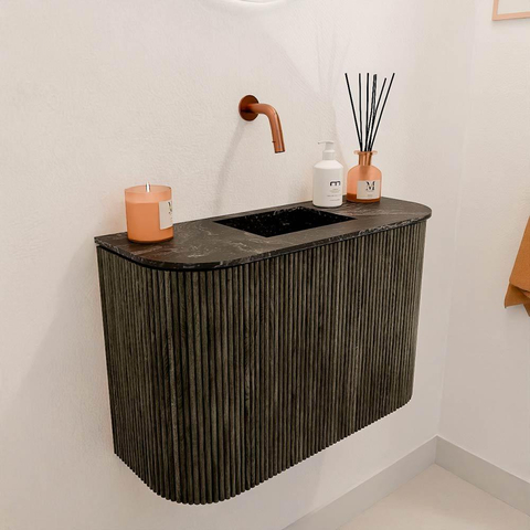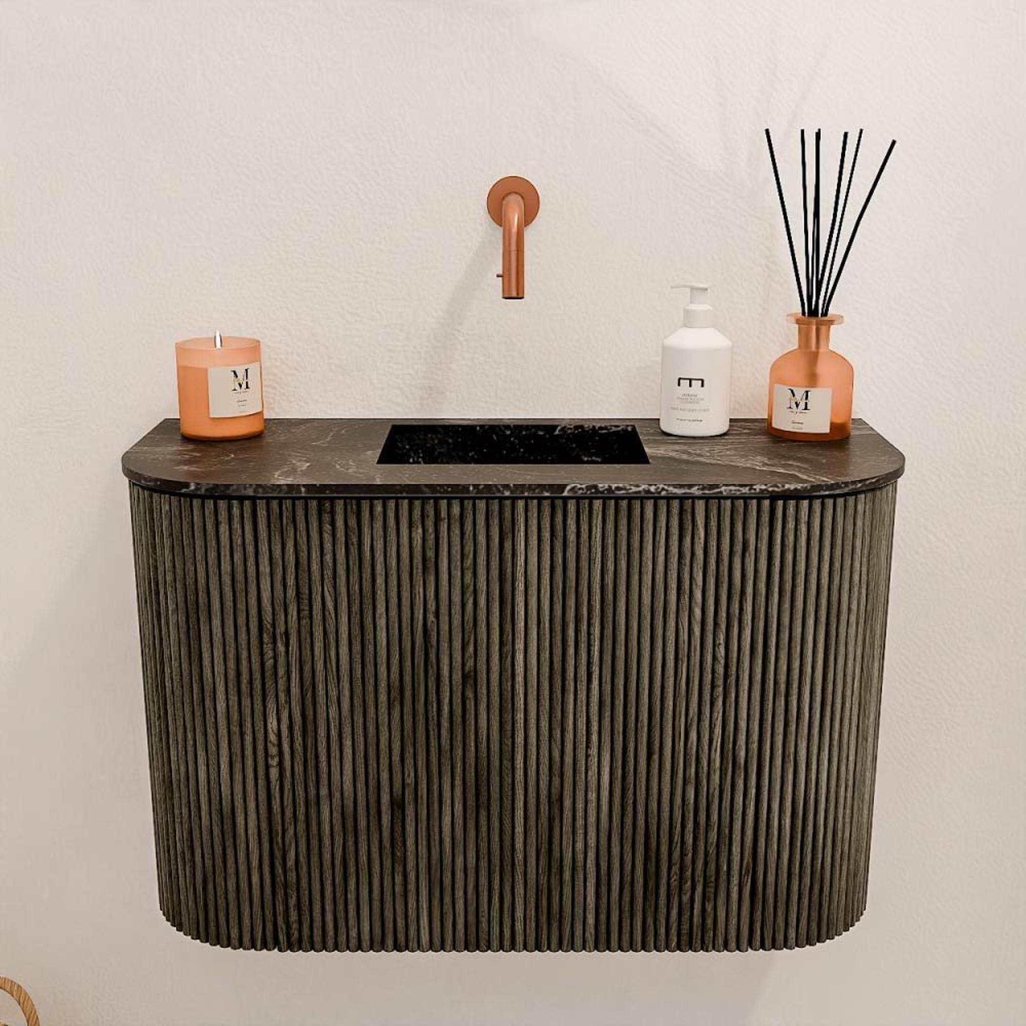 Les courbes uniques à la fois sur le côté gauche et droit donnent au meuble un caractère particulier et raffiné. La couleur profonde Shadow combinée à la structure verticale côtelée sur les façades offre un aspect intemporel et luxueux. Ce meuble n’est pas simplement un élément fonctionnel, mais une véritable déclaration de design qui apporte une touche exclusive à votre salle de bains. L’utilisation de matériaux naturels tels que le chêne massif et le placage de chêne dégage chaleur et qualité. Vous créez ainsi une salle de bains non seulement belle à voir, mais aussi un lieu où vous vous sentez bien.