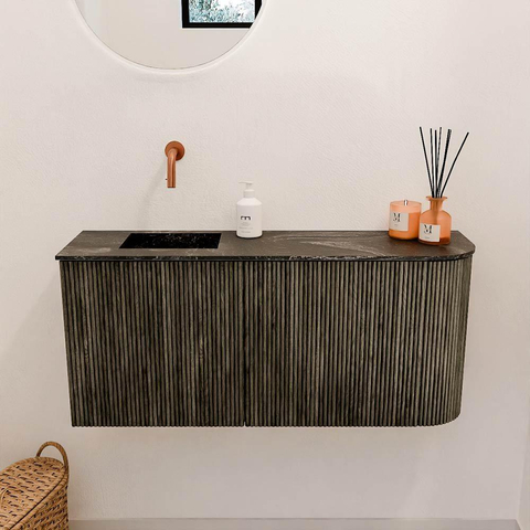 Le meuble se distingue immédiatement par la combinaison élégante de chêne massif et de placage de chêne, fini dans la couleur chaude Shadow. La structure à rainures verticales donne à l'ensemble une apparence intemporelle et luxueuse qui s'intègre sans effort dans les salles de bains modernes comme classiques. Cette finition élégante confère à votre salle de bains une atmosphère personnelle et de haute qualité dont vous pouvez être fier. Grâce à l'arrondi subtil sur le côté droit, le meuble paraît particulièrement raffiné et unique.