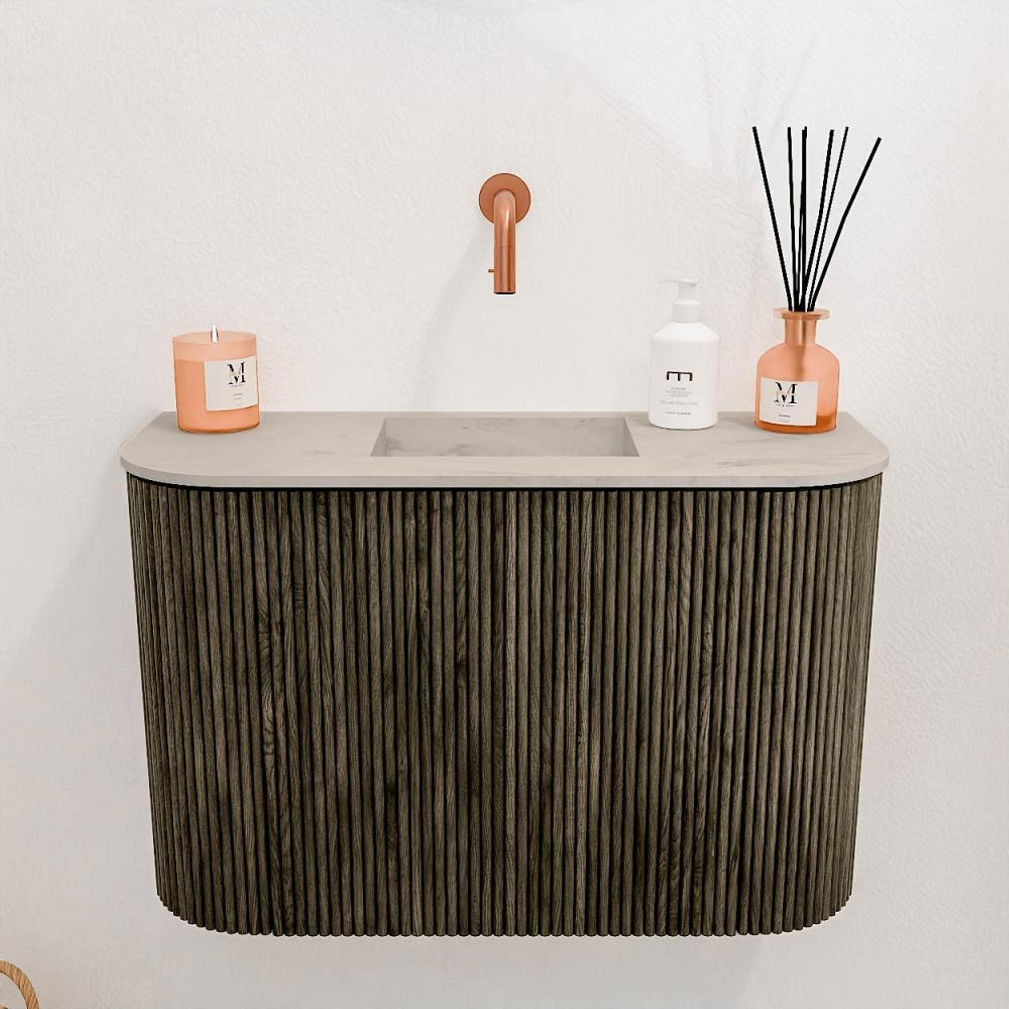 Avec ce magnifique meuble, vous donnez à votre salle de bains ou toilette d'invités un aspect élégant et naturel. La combinaison des façades en chêne massif et des panneaux latéraux en placage chêne dans la couleur chaude Shadow crée une ambiance intemporelle qui dégage calme et élégance. Grâce aux coins arrondis des deux côtés, le meuble est non seulement doux et accueillant au toucher, mais il a aussi un aspect particulièrement raffiné. Les dimensions compactes le rendent parfait pour les petits espaces, sans compromettre le rangement ou le confort. La vasque fournie en couleur Opalo avec une position centrale apporte une touche fraîche et lumineuse, tandis que l'absence de trous de robinet vous laisse la liberté de choisir le robinet parfait qui correspond à votre style. Ainsi, vous transformez facilement votre salle de bains en un lieu où fonctionnalité et design vont de pair.