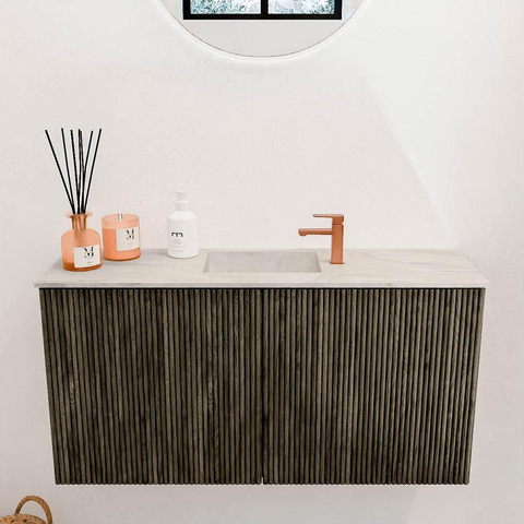 Avec son design intemporel et la couleur chaude et profonde Shadow, ce meuble est un véritable point fort dans votre salle de bains. La structure à rainures verticales sur les façades donne au meuble une apparence unique qui semble à la fois moderne et naturelle. Grâce à la combinaison de chêne massif et de placage chêne, le meuble dégage qualité et savoir-faire. Cela fait que votre salle de bains obtient une atmosphère élégante et accueillante dont vous profitez chaque jour. De plus, grâce à sa couleur neutre et ses détails élégants, le meuble s’adapte facilement à différents styles d’intérieur, du moderne épuré au chaleureux campagnard.