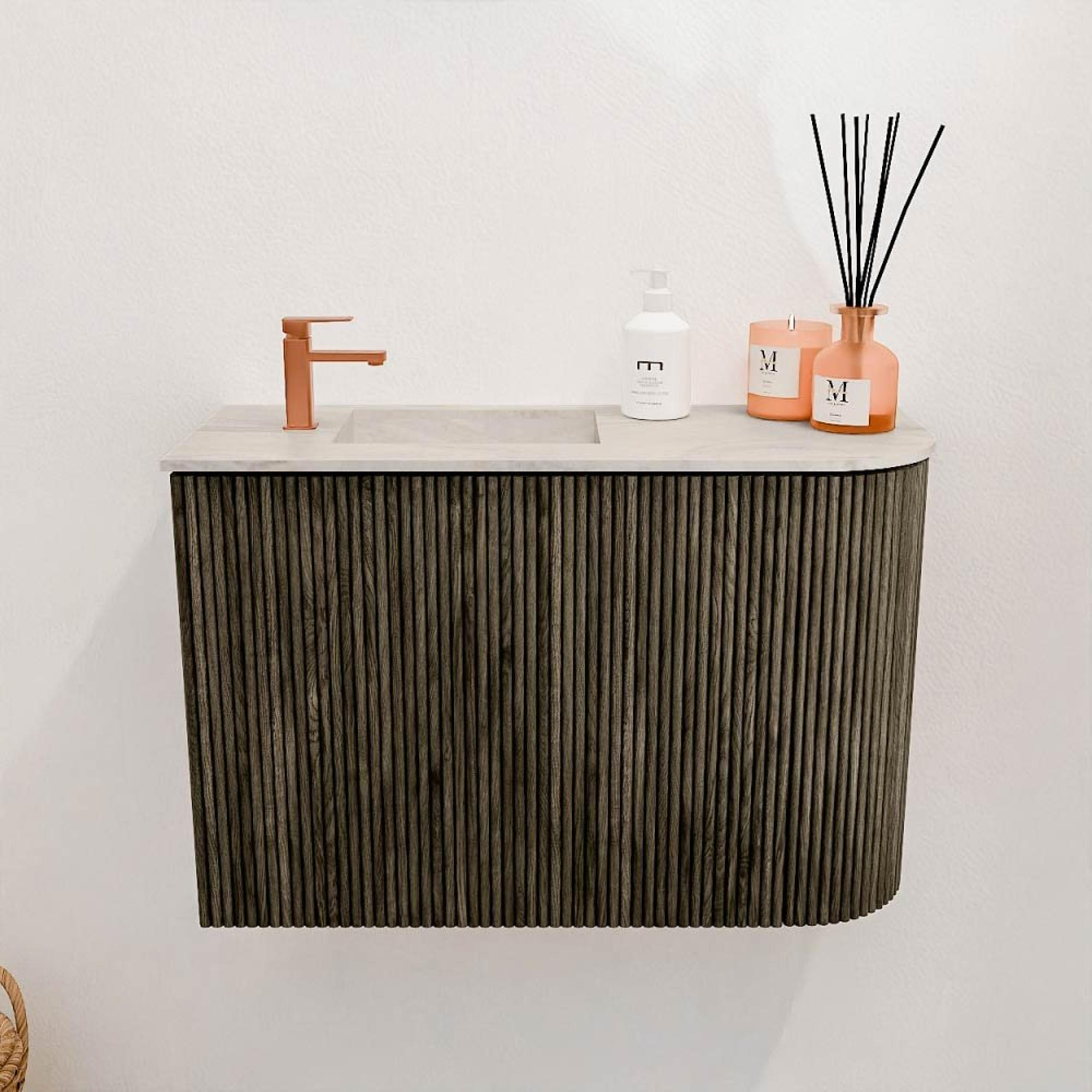 La combinaison du chêne massif et de la couleur raffinée Shadow assure une élégance intemporelle qui donne immédiatement un aspect luxueux à votre salle de bains. Les rainures verticales sur la façade créent un subtil jeu de lignes qui confère caractère et profondeur au meuble. Grâce au design arrondi sur le côté droit, l'ensemble paraît doux et moderne, sans angles vifs qui rétréciraient visuellement l'espace. Ces détails élégants rendent le meuble adapté à divers styles de salle de bains, de l'industriel au scandinave. Vous obtenez ainsi un meuble qui n'est pas seulement beau, mais aussi un véritable créateur d'ambiance dans votre salle de bains.