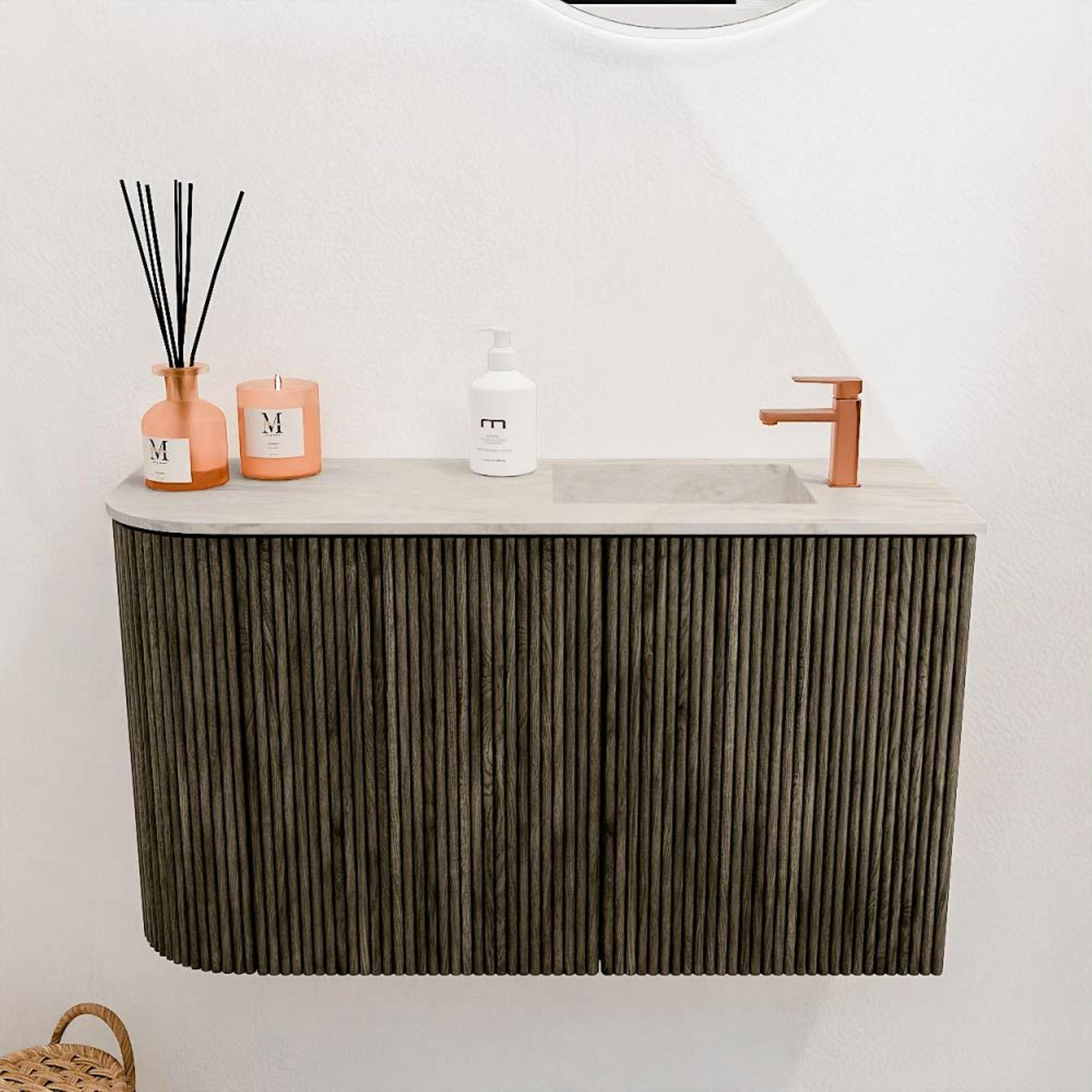 Le meuble attire immédiatement l’attention par son design moderne avec un arrondi unique à gauche. La couleur Shadow lui confère une apparence intemporelle et profonde qui s’intègre sans effort dans divers styles de salle de bains. Le lavabo en Ostra crée un contraste subtil, rendant l’ensemble frais et lumineux. Ce jeu élégant de couleurs et de formes fait de ce meuble un véritable point focal, sans qu’il domine. Ainsi, vous profitez d’une salle de bains qui non seulement est belle, mais qui dégage aussi une sensation de calme et de luxe.