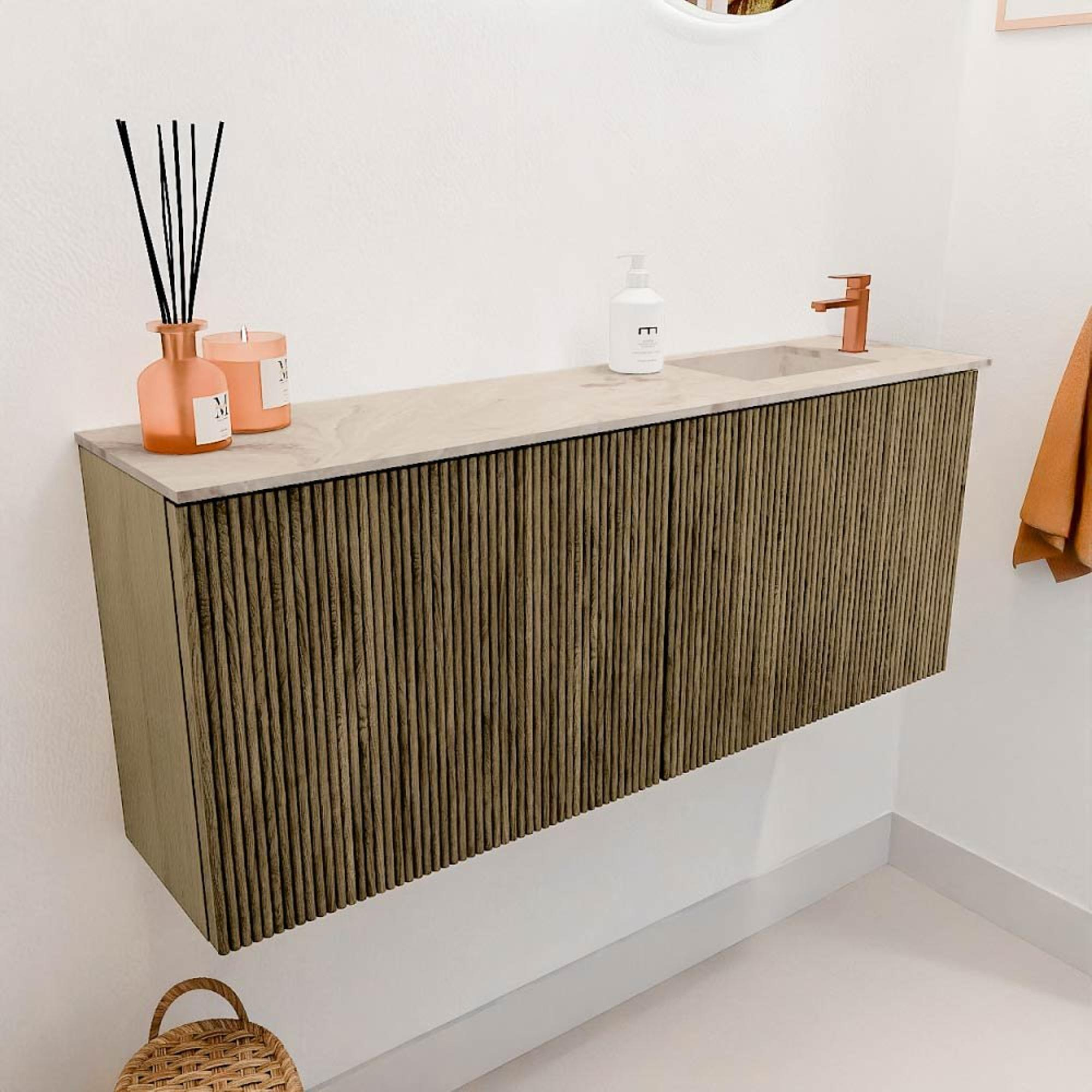 La couleur chaude Dusk et les détails de rainures verticales en chêne massif donnent à ce meuble un aspect intemporel et luxueux. Le bois naturel crée une atmosphère authentique qui améliore immédiatement votre salle de bains. La combinaison subtile avec la vasque Frappe crée un contraste élégant qui dégage calme et classe. Ce meuble s'intègre facilement dans des salles de bains modernes ou classiques et fait de votre espace un véritable point fort.