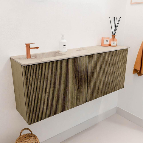 Avec ce magnifique meuble, vous offrez à votre salle de bains ou toilettes d'invités une mise à jour élégante et pratique immédiate. Le design compact de 100 cm de large s'adapte parfaitement aux petits espaces, sans compromettre la facilité d'utilisation ni l'apparence. Grâce à la couleur subtile Dusk et aux rainures verticales élégantes, la pièce acquiert une atmosphère chaleureuse et moderne qui invite à la détente. La vasque, avec sa douce couleur Frappe et son trou de robinet placé à gauche, complète l'ensemble et assure une disposition fonctionnelle. Ce meuble combine sans effort esthétique et détails intelligents, faisant de votre salle de bains un espace non seulement beau mais aussi agréable à utiliser. Ainsi, vous profitez chaque jour d'un espace ordonné et soigné où il fait bon passer du temps.