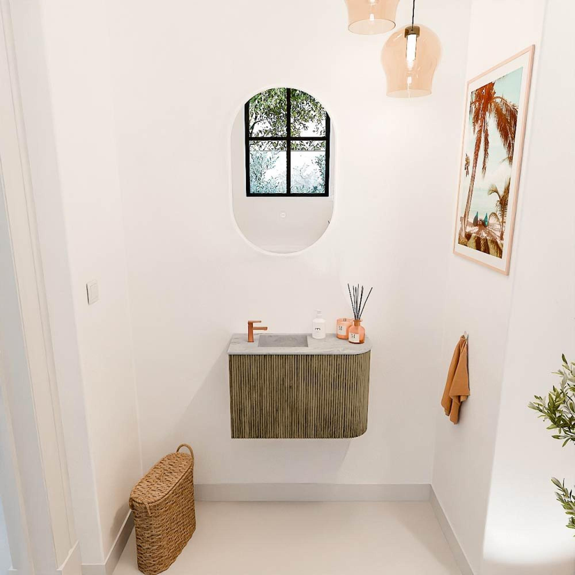 Avec ce meuble compact et élégant, vous donnez immédiatement à votre salle de bains ou toilettes d'invités une apparence moderne et chaleureuse. Le meuble combine un design astucieux avec un arrondi doux sur le côté droit, ce qui le rend non seulement pratique, mais aussi un subtil élément accroche-regard. Grâce à la fixation murale, le sol reste libre, ce qui agrandit visuellement l'espace et facilite le nettoyage. La couleur apaisante Dusk crée une atmosphère intemporelle qui s'adapte sans effort à différents styles d'intérieur. La vasque intégrée avec un seul trou de robinet à gauche complète l'ensemble et vous offre un bel endroit pour vous laver les mains sans prendre de place inutile. Ainsi, vous transformez votre salle de bains en un lieu où fonctionnalité et design se rencontrent parfaitement.
