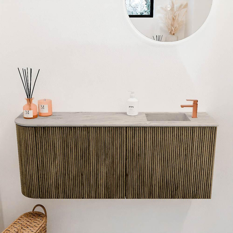 Le meuble attire immédiatement l’attention par son design raffiné avec des nervures verticales et la combinaison de chêne massif et de placage chêne. La couleur chaude Dusk crée une atmosphère naturelle et calme, parfaite pour donner à votre salle de bains une apparence luxueuse. Grâce à l’arrondi subtil sur le côté gauche, le meuble a un aspect particulier et distinctif, sans dominer. Cela permet au meuble de s’adapter facilement à différents styles d’intérieur. Ainsi, vous profitez d’une salle de bains qui n’est pas seulement belle, mais aussi un véritable point fort.