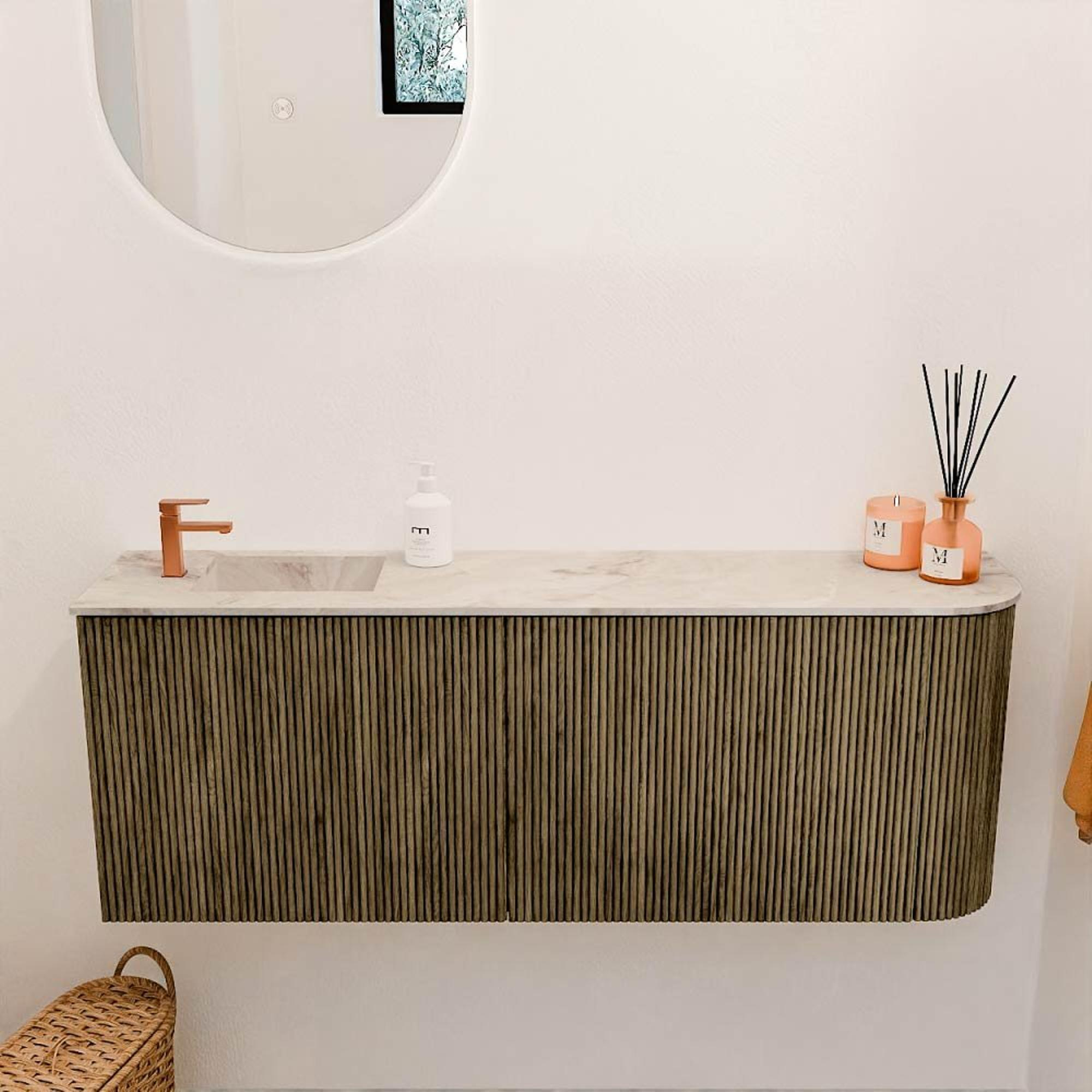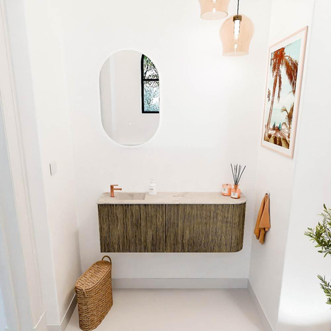 Ce meuble se distingue immédiatement par son design raffiné et sa finition de haute qualité. La couleur chaude Dusk crée une ambiance calme et élégante, tandis que la forme arrondie sur le côté droit donne au meuble un accent ludique et moderne. La vasque de couleur Frappe ajoute une touche subtile et naturelle qui s'harmonise parfaitement avec différents styles de salle de bains. Par cette combinaison, vous créez une salle de bains qui est non seulement pratique, mais aussi un véritable point de mire. Ainsi, vous profitez d'un espace élégant qui vous inspire chaque jour.