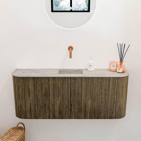 Avec ce magnifique meuble, vous donnez immédiatement à votre salle de bains un aspect élégant et chaleureux. Il combine un design moderne avec des matériaux naturels, ce qui en fait un véritable point focal dans chaque pièce. Grâce aux courbes subtiles des deux côtés, le meuble paraît particulièrement élégant et doux, créant une atmosphère accueillante. L’association de la couleur profonde et apaisante Dusk avec le Glace clair de la vasque crée un beau contraste qui apporte calme et équilibre. Ce meuble n’est pas seulement beau, mais aussi extrêmement pratique : avec deux portes spacieuses, vous rangez tous vos accessoires de salle de bains de manière ordonnée et hors de vue. La fixation murale donne en outre un effet d’espace, ce qui rend votre salle de bains plus grande et plus aérée. Grâce à la position centrale de la vasque, le meuble est parfaitement adapté à votre usage quotidien, tandis que l’absence de trous de robinet vous laisse la liberté de choisir le robinet qui correspond le mieux à votre style et à vos souhaits. Ainsi, vous profitez d’un meuble de salle de bains qui répond à toutes vos attentes, tant sur le plan fonctionnel qu’esthétique.