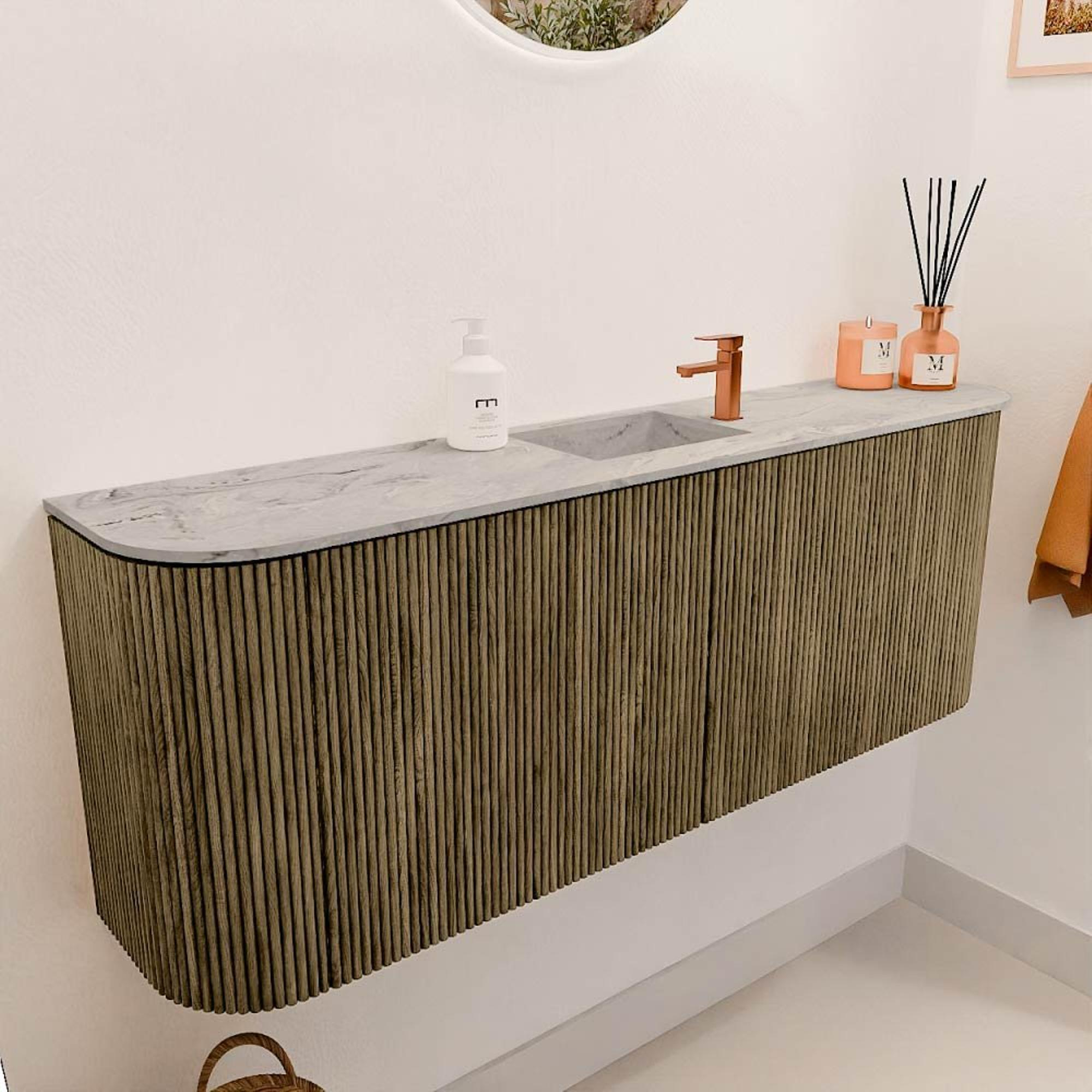 Mondiaz JOYA-DLUX 113.2cm meuble de salle de bains - arrondi gauche et droite couleur Dusk - Vasque FAYE position Milieu 1 trou de robinet couleur Glace.