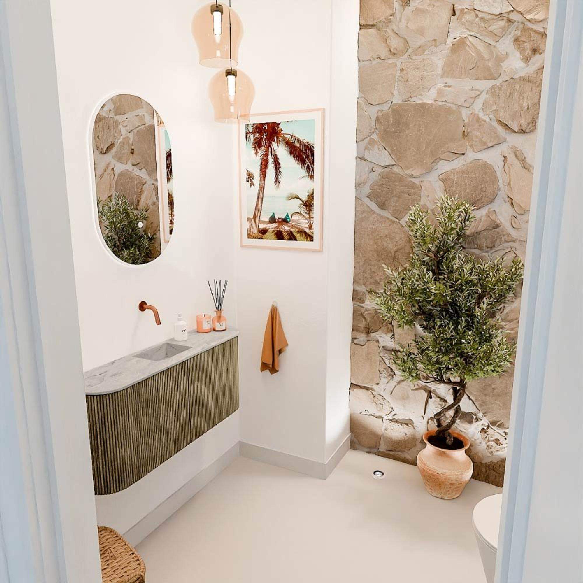 Transformez votre salle de bains avec ce magnifique meuble qui combine aisément style et fonctionnalité. Le meuble dégage un luxe intemporel grâce aux courbes subtiles des deux côtés et à la couleur chaude Dusk, qui apporte une ambiance chaleureuse et naturelle. La vasque de couleur Glace ajoute une touche fraîche et claire et est parfaitement positionnée au centre, vous offrant tout l’espace nécessaire pour une utilisation confortable sans trou de robinet. Grâce aux dimensions réfléchies, ce meuble s’intègre parfaitement dans divers styles de salles de bains, du moderne au classique. Le meuble offre non seulement une belle apparence, mais aussi des avantages pratiques : les deux portes à fermeture douce s’ouvrent facilement d’une légère pression, ce qui maintient votre salle de bains toujours propre et silencieuse. Vous créez ainsi un espace apaisant et organisé où vous commencez et terminez chaque jour avec plaisir.