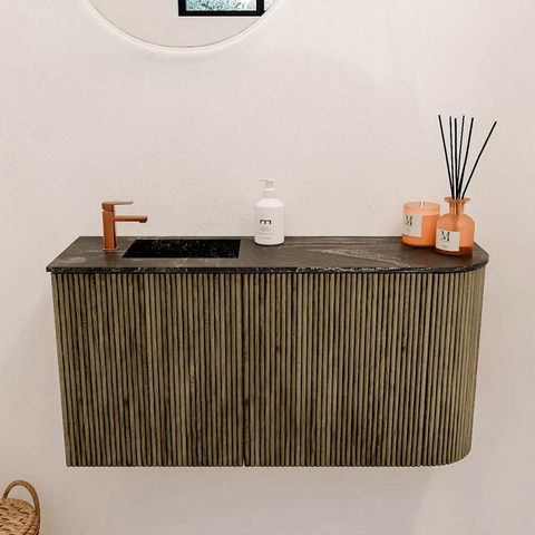 La combinaison de la couleur profonde Dusk avec la vasque Lava crée un design remarquable tout en restant discret. Le meuble présente une apparence moderne avec un arrondi doux sur le côté droit, ce qui donne une touche ludique et élégante à l’ensemble. Il s’intègre parfaitement dans des intérieurs de salle de bains à la fois épurés et chaleureux. Avec ce meuble, vous apportez un élément intemporel chez vous qui attire facilement l’attention sans dominer. Le contraste subtil des couleurs et le design réfléchi en font un véritable point fort qui donne à votre salle de bains une allure luxueuse.