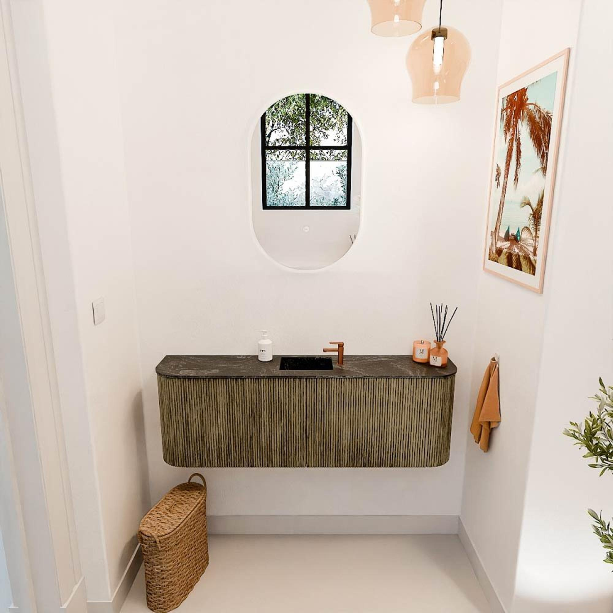 Transformez votre salle de bains avec un meuble qui n'est pas seulement fonctionnel, mais qui apporte aussi une ambiance chaleureuse et naturelle. Ce meuble élégant de 123,2 cm de largeur s'intègre parfaitement dans les salles de bains modernes où design et facilité d'utilisation se rencontrent. Grâce aux courbes subtiles des deux côtés, votre salle de bains obtient une atmosphère douce et accueillante. La combinaison du cadre profond couleur Dusk et de la vasque chaude Lava crée un ensemble harmonieux qui attire immédiatement l'attention. Que vous planifiez une rénovation complète ou une mise à niveau raffinée, ce meuble ajoute une sensation de luxe et de calme à votre routine quotidienne.
