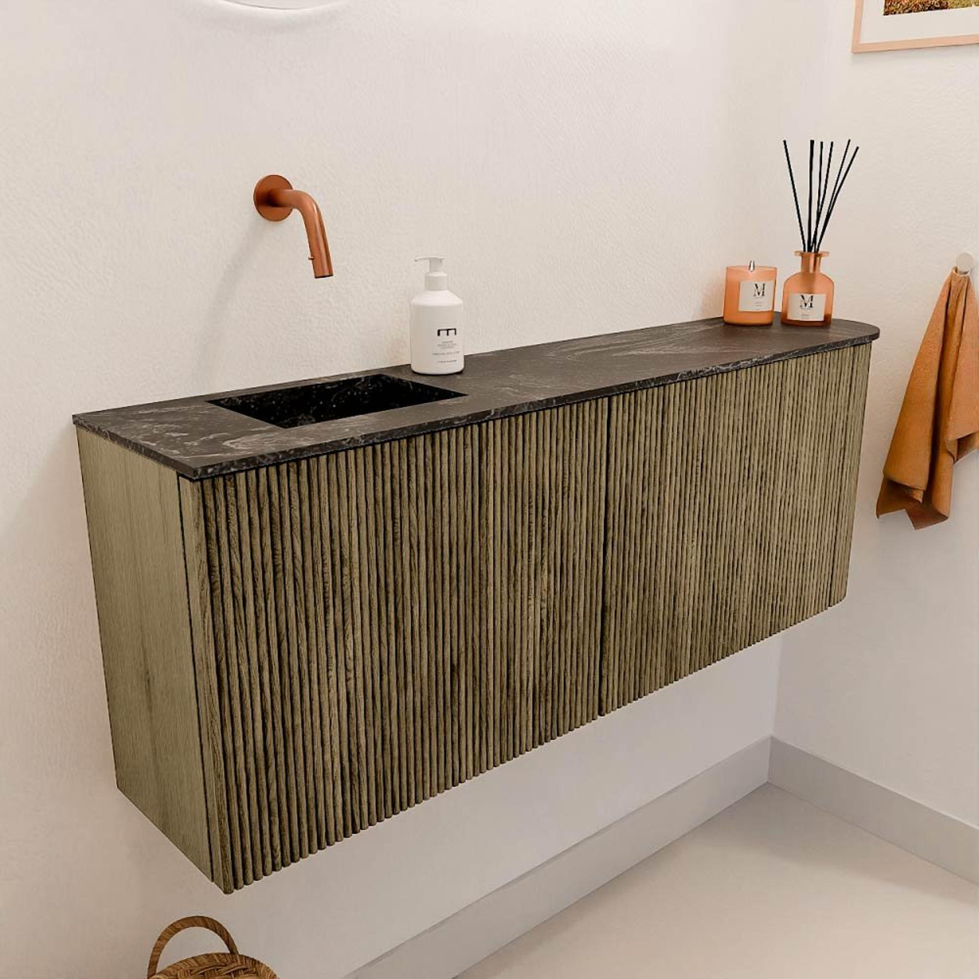 Le meuble attire immédiatement l’attention grâce à son arrondi raffiné sur le côté droit et à la couleur chaude Dusk, qui ensemble donnent un aspect unique et moderne. Cette combinaison fait que le meuble n’est pas seulement fonctionnel, mais aussi un véritable point focal dans votre salle de bains. La vasque Lava ajoute un accent robuste et contemporain. Grâce à ce choix de couleur et de forme réfléchi, le meuble s’intègre sans effort dans différents styles de salle de bains, du moderne épuré au chaleureux et naturel. Ainsi, vous profitez d’une salle de bains qui n’est pas seulement pratique, mais aussi inspirante et accueillante.