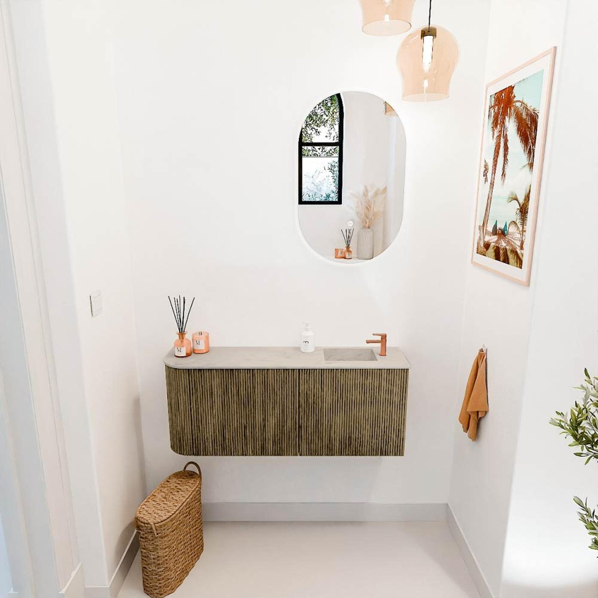 Ce meuble se distingue immédiatement par sa couleur raffinée Dusk, qui apporte une ambiance chaleureuse et accueillante. L'arrondi subtil sur le côté gauche donne un caractère unique à l'ensemble et rend le meuble légèrement différent des solutions standard. La vasque en Opalo ajoute une touche claire et fraîche qui s'harmonise parfaitement avec les teintes naturelles du meuble. Grâce au design minimaliste et à la finition de haute qualité, ce meuble s'intègre sans effort dans divers styles d'intérieur, du moderne au classique. Ainsi, vous profitez d'une salle de bains qui n'est pas seulement fonctionnelle, mais qui ajoute aussi vraiment à votre expérience de vie.