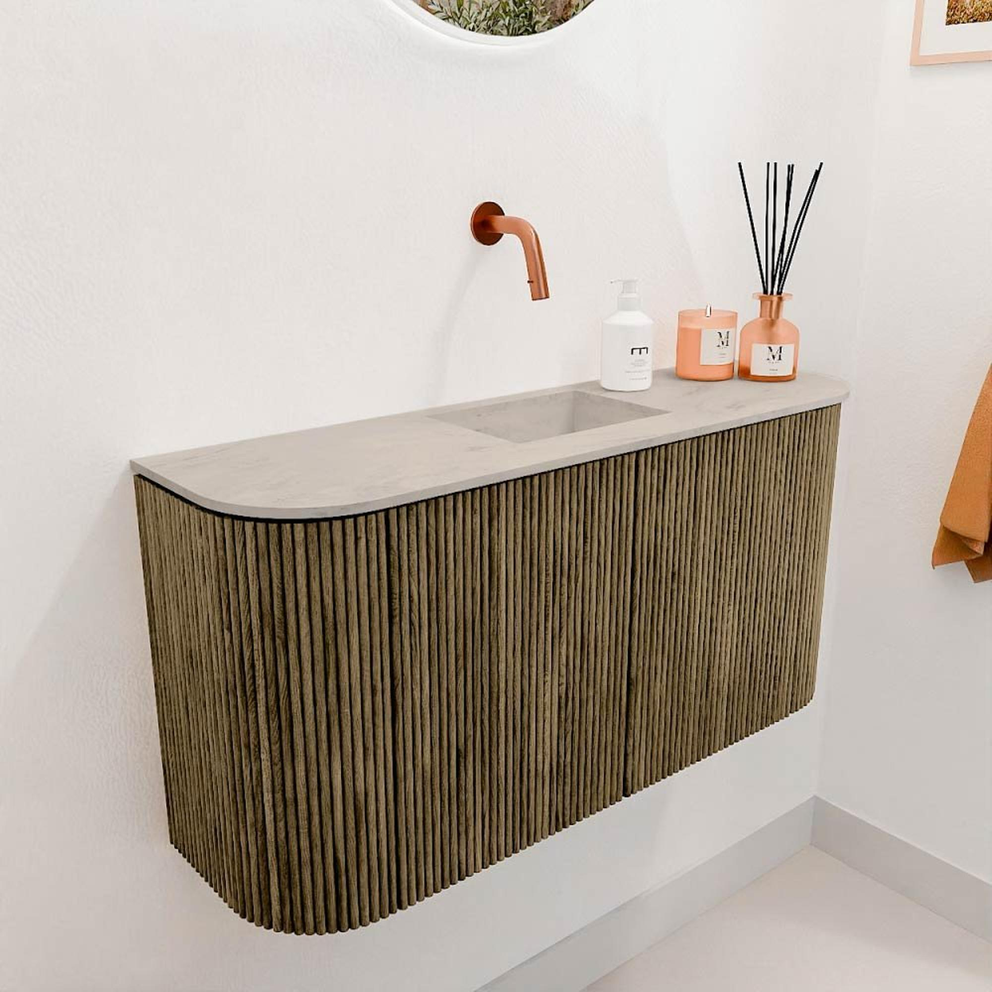 Transformez votre salle de bains avec ce magnifique meuble qui est non seulement pratique, mais qui apporte aussi une ambiance chaleureuse et naturelle. Grâce aux arrondis subtils des deux côtés et à la couleur élégante Dusk, votre espace obtient immédiatement une touche moderne et atmosphérique. Le meuble offre suffisamment d’espace de rangement derrière les deux portes, afin que vous puissiez ranger tous vos accessoires de salle de bains proprement et hors de vue. La vasque de couleur Opalo avec un bassin placé au centre sans trou de robinet complète l’ensemble et vous donne la liberté de choisir le robinet qui correspond le mieux à votre style. Ce meuble est parfait pour ceux qui aiment une combinaison de fonctionnalité et de design, et souhaitent transformer la salle de bains en un lieu apaisant où commencer chaque jour avec plaisir.