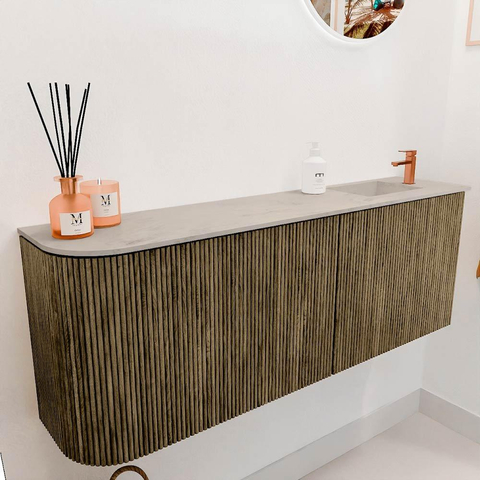 Avec son élégant arrondi à gauche et la couleur chaude et naturelle Dusk, ce meuble apporte une ambiance raffinée à votre salle de bains. La combinaison de façades en chêne massif avec des panneaux latéraux en placage chêne offre un aspect intemporel qui s'adapte aisément à divers styles d'intérieur. Le contraste subtil de couleur avec la vasque en Opalo rend l'ensemble encore plus attrayant. Ainsi, vous créez une salle de bains qui est non seulement fonctionnelle, mais aussi invitante à la détente et au plaisir.