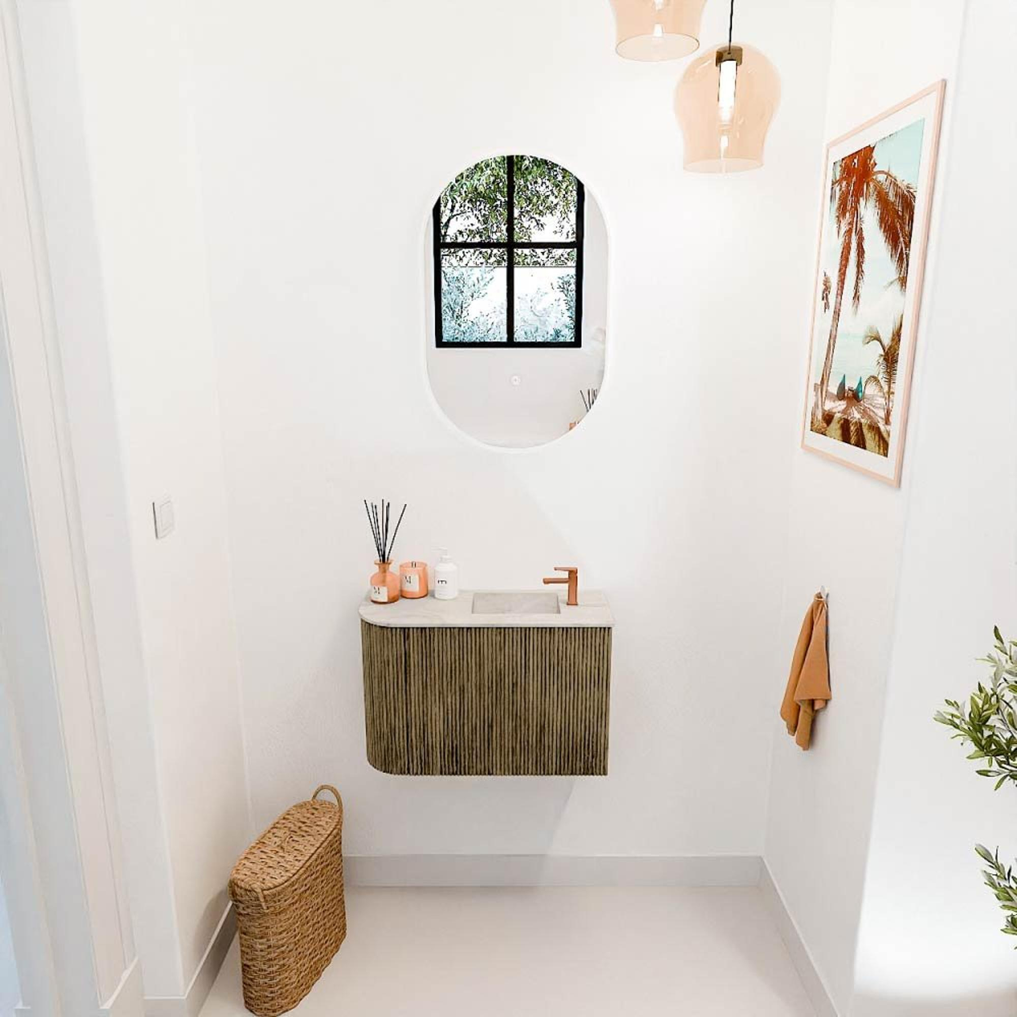 Avec ce meuble, vous donnez immédiatement à votre salle de bains ou toilette d'invités une mise à niveau élégante et pratique. Le design compact avec une largeur de 61,6 cm s'adapte parfaitement aux petits espaces, sans compromettre le confort ou l'apparence. La couleur chaude Dusk combinée à l'aspect naturel du chêne massif et du placage de chêne crée une atmosphère intemporelle qui donne à votre salle de bains un aspect luxueux et accueillant. La vasque avec une subtile couleur Ostra et un trou de robinet à droite complète l'ensemble et vous offre une grande facilité d'utilisation. Grâce à la forme arrondie intelligente sur le côté gauche, vous optimisez chaque centimètre, ce qui est un grand avantage surtout dans les petites salles de bains. Ce meuble combine sans effort fonctionnalité et apparence raffinée, ce qui en fait un ajout précieux qui transforme votre salle de bains en un lieu où vous commencez chaque jour avec plaisir.