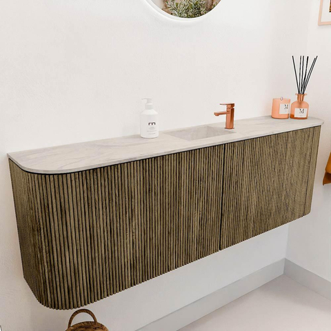 Avec ce magnifique meuble, vous donnez à votre salle de bains une apparence élégante et chaleureuse qui attire immédiatement le regard. La combinaison du bois de haute qualité et de la subtile structure à nervures verticales assure un design intemporel qui s’intègre sans effort dans différents styles d’intérieur. Grâce aux angles arrondis des deux côtés, le meuble paraît non seulement élégant, mais aussi convivial et accueillant. Le lavabo central avec un trou de robinet complète l’ensemble et vous offre tout l’espace nécessaire pour effectuer votre routine quotidienne de manière confortable et efficace. Ce meuble n’est pas simplement un élément fonctionnel