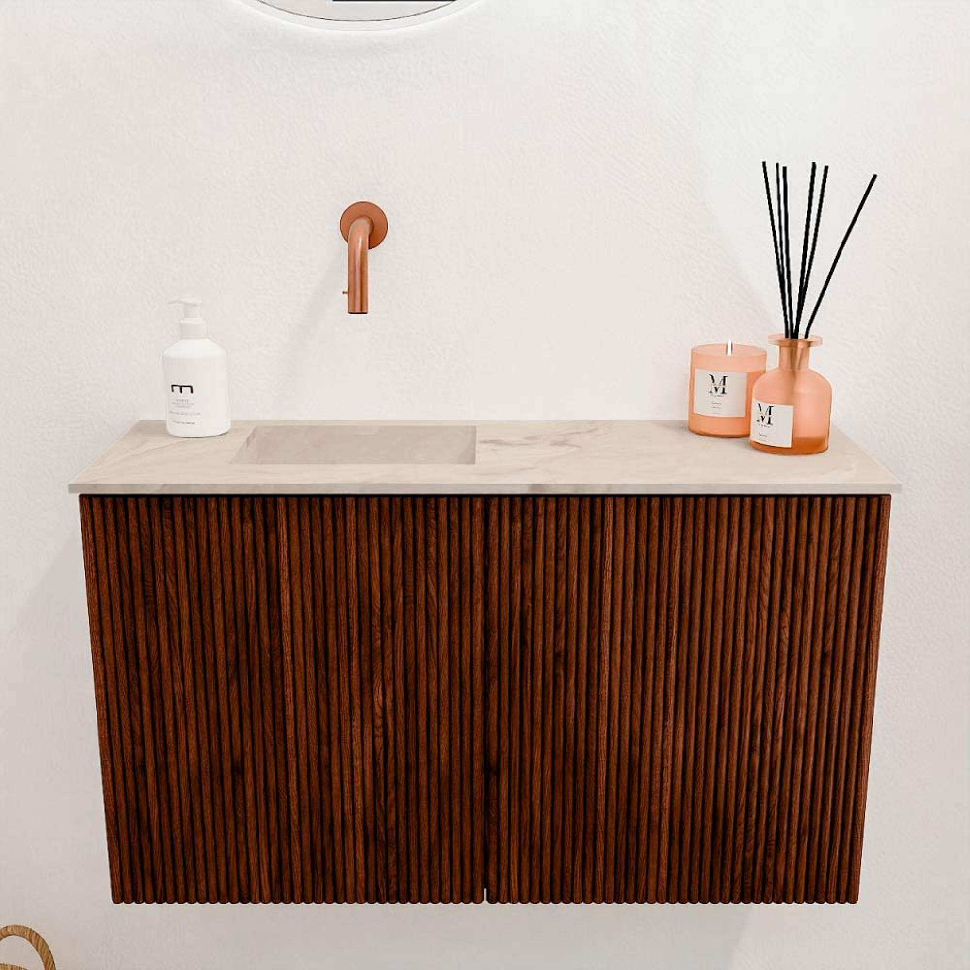 La combinaison de chêne massif à l'avant et de placage chêne sur les côtés donne à ce meuble une apparence naturelle et luxueuse. La couleur chaude Ruby apporte une élégance intemporelle qui s'harmonise facilement avec différents styles d'intérieur. Que vous aimiez le moderne, le campagnard ou l'industriel, ce meuble ajoute toujours une touche raffinée. Le contraste subtil avec le plan vasque Frappe rend l'ensemble encore plus attrayant et crée un équilibre harmonieux dans votre espace toilette. Ainsi, vous créez un endroit qui n'est pas seulement fonctionnel, mais invite aussi à la détente.