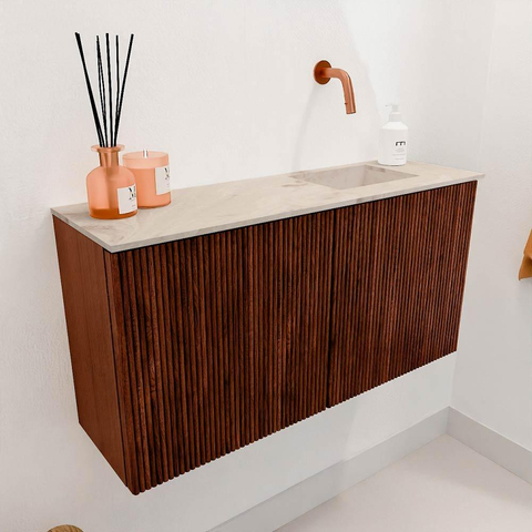 Le meuble se distingue immédiatement par son design intemporel et la couleur chaude Ruby qui évoque un sentiment de luxe et de confort. Les rainures verticales sur le chêne massif donnent une texture et une apparence uniques, faisant de ce meuble un véritable point focal dans votre salle de bains. Cette finition élégante assure que le meuble s'intègre parfaitement dans des salles de bains modernes comme classiques. En choisissant un meuble avec un impact visuel aussi fort, vous donnez à votre salle de bains une touche personnelle et raffinée que vous apprécierez chaque jour.