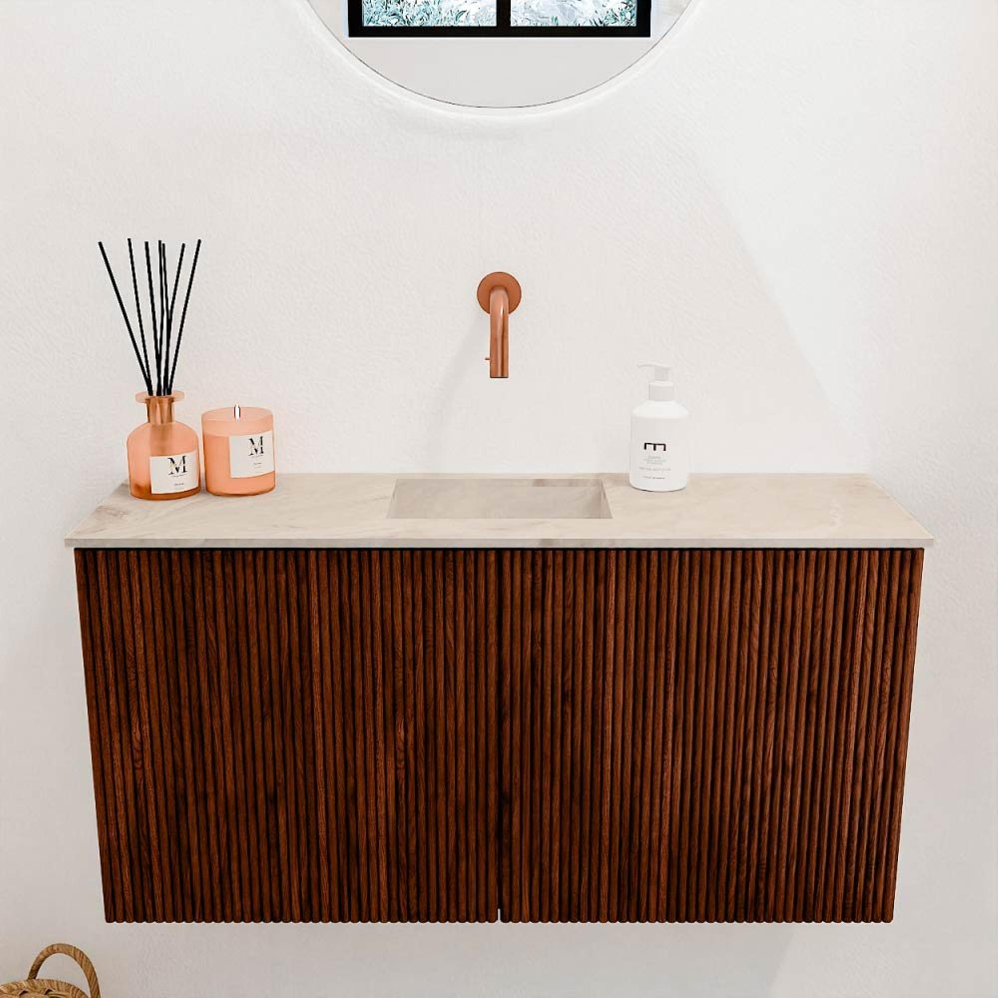 - Couleur : meuble Ruby avec vasque Frappe – aspect chaleureux et naturel