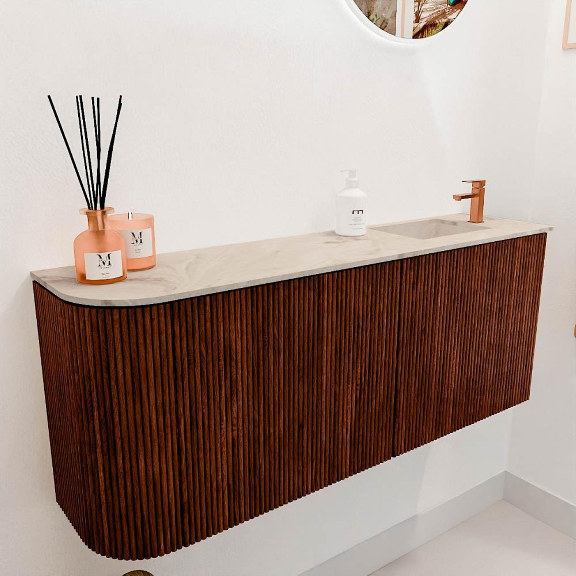 La combinaison de la couleur chaude Ruby avec la structure à rainures verticales donne au meuble un aspect intemporel et luxueux. Les façades en chêne massif et les côtés en placage de chêne assurent un look naturel et haut de gamme. Ce meuble est un véritable accroche-regard qui s'intègre facilement dans les salles de bains modernes comme classiques. Grâce au design subtil et au choix de couleur réfléchi, vous ajoutez une touche d'élégance sans qu'elle domine. Ainsi, vous créez une salle de bains qui est non seulement fonctionnelle, mais aussi accueillante et stylée.