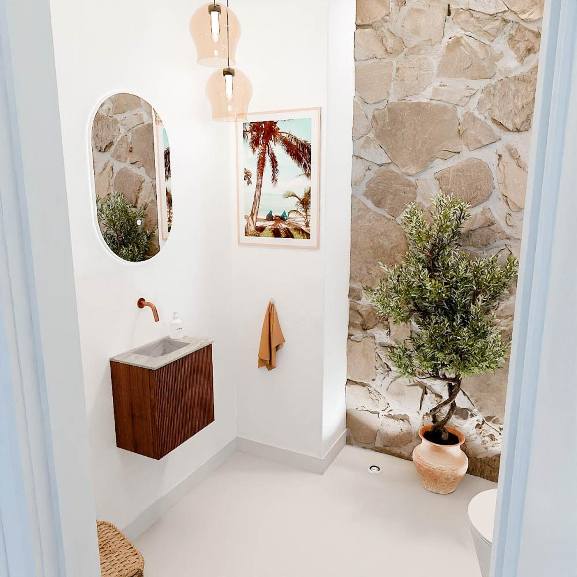 Avec ce meuble compact et élégant, vous donnez immédiatement à vos toilettes ou à une petite salle de bains un aspect frais et moderne. Le meuble combine une magnifique couleur Ruby avec une vasque au design épuré dans la teinte subtile Glace, ce qui crée une ambiance élégante et chaleureuse. Grâce à la taille intelligente de 40 cm de large, il s'adapte facilement aux petits espaces sans compromettre le confort ou la fonctionnalité. La vasque est soigneusement conçue avec la position du robinet au milieu, vous laissant toute la liberté de choisir un robinet. Ce meuble élève votre salle de bains à un niveau supérieur et rend l'utilisation quotidienne beaucoup plus agréable et facile.