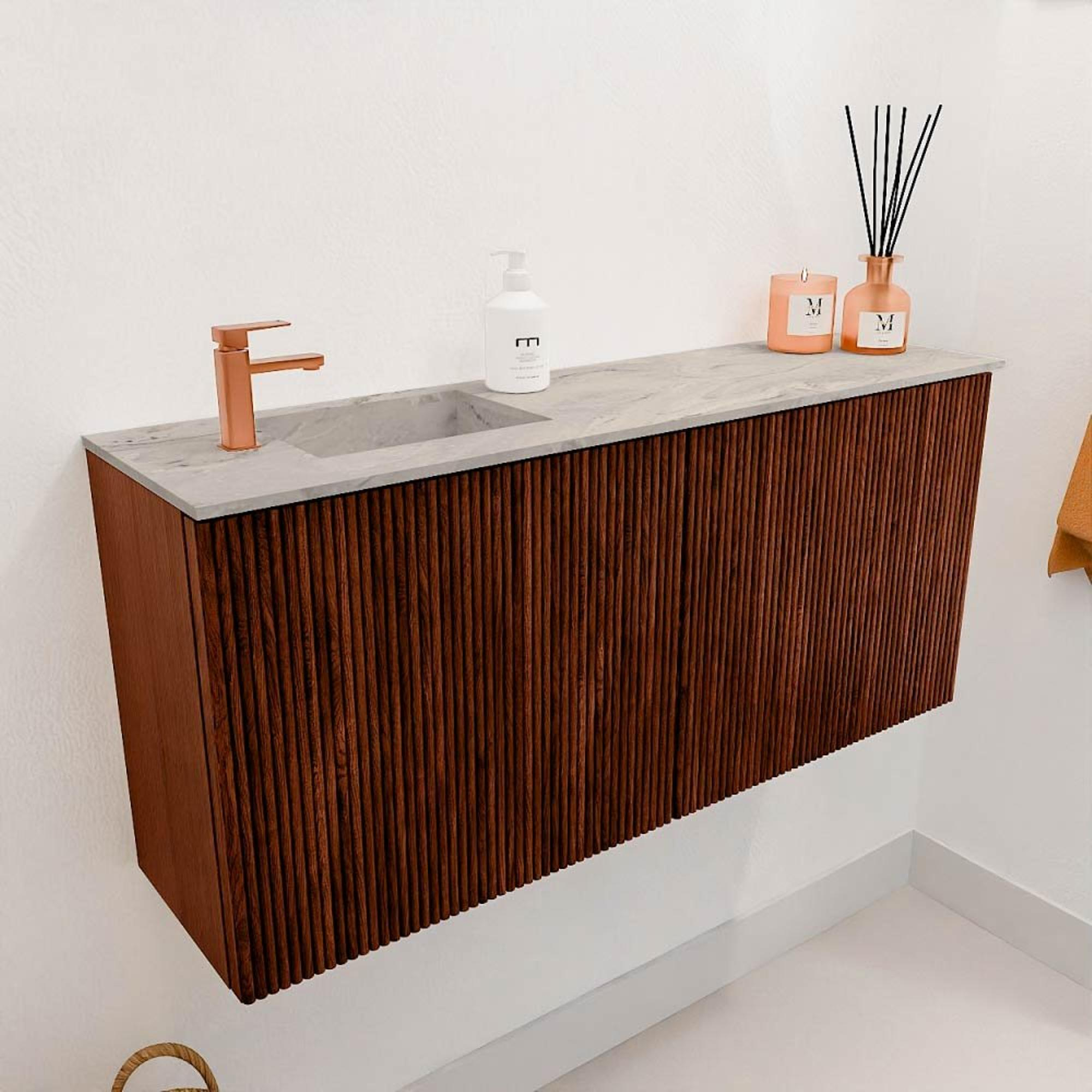 Le meuble se distingue immédiatement par son design élégant avec des rainures verticales et la couleur chaude Ruby. La combinaison de chêne massif et de placage chêne offre une apparence naturelle et authentique qui convient parfaitement aux salles de bains modernes et classiques. Le contraste subtil de couleur entre le meuble et la vasque claire crée un ensemble harmonieux qui dégage calme et luxe. Ce design élégant rend votre salle de bains non seulement plus belle, mais augmente également la valeur de votre intérieur.