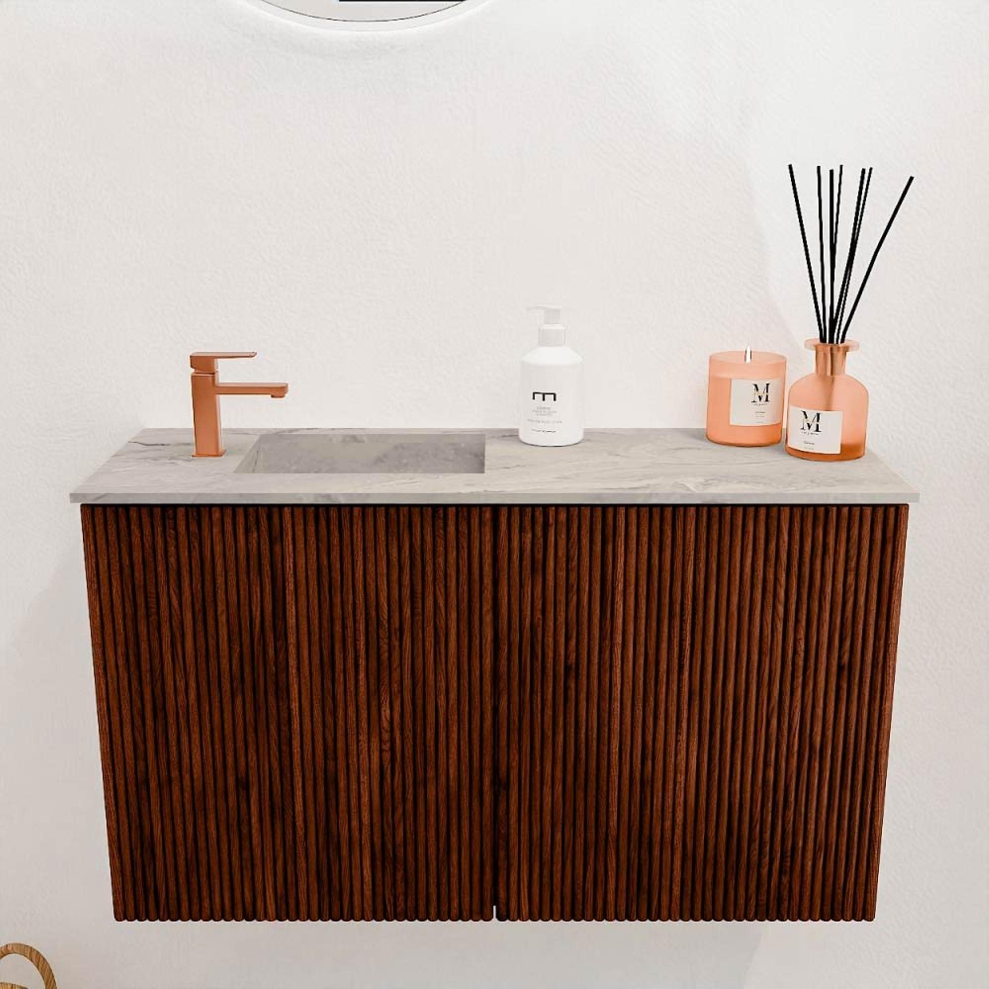 Ce meuble se distingue immédiatement par son apparence élégante. La couleur chaude Ruby combinée aux rainures verticales en chêne massif lui confère un look luxueux et intemporel. Le plan vasque clair en Glace crée un beau contraste et rend le meuble particulièrement frais. Vous ajoutez ainsi une touche de classe à votre salle de bains, sans que cela devienne trop dominant. Le design est moderne, mais avec une touche naturelle qui s'adapte parfaitement à divers styles d'intérieur.