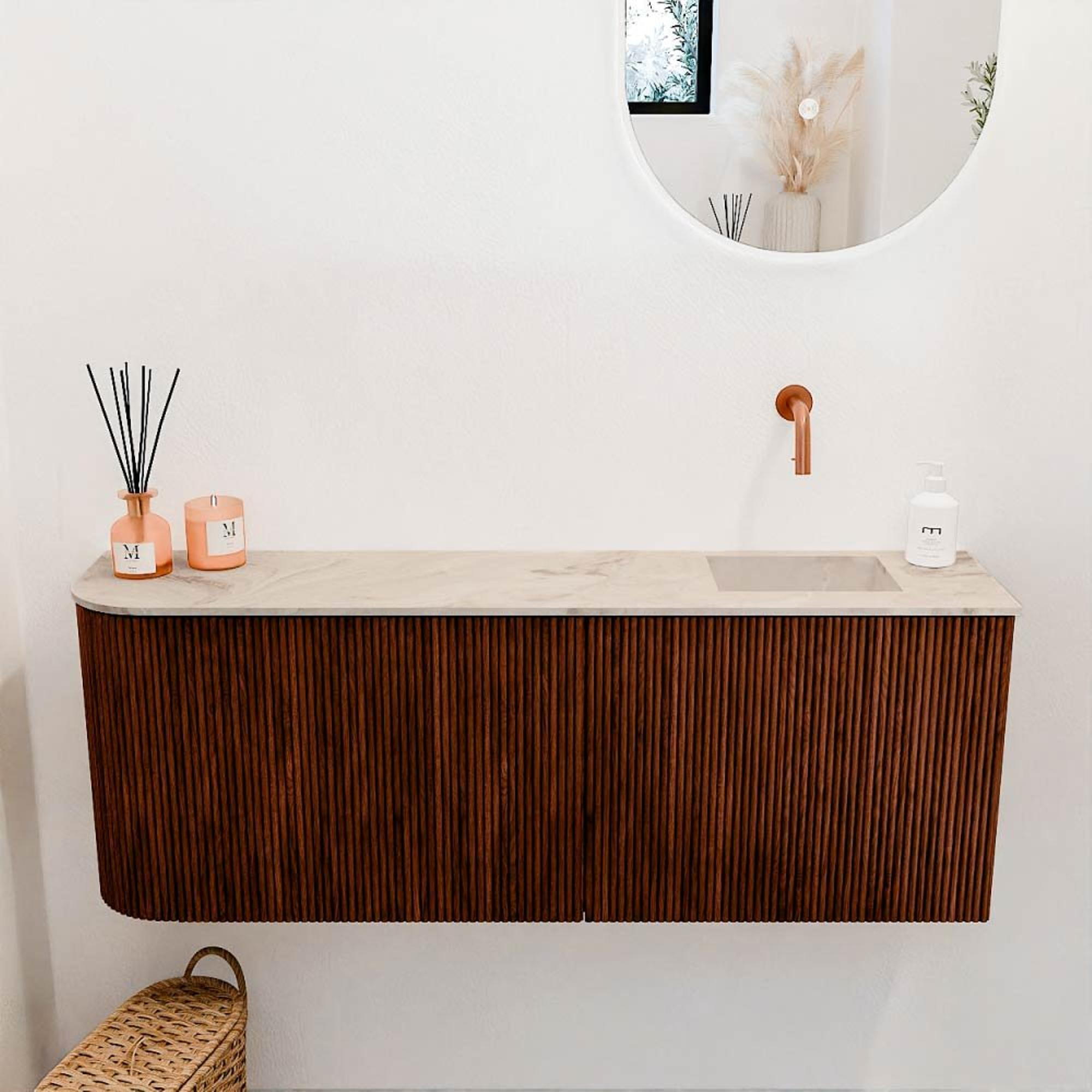 Avec sa couleur Ruby élégante et la structure à rainures verticales sur les façades, ce meuble est un véritable point focal. Les tons chauds et le chêne naturel offrent une apparence intemporelle qui s'harmonise aisément avec les salles de bains modernes comme classiques. Grâce à l'arrondi sur le côté gauche, le meuble acquiert un caractère unique, donnant une touche personnelle à votre salle de bains. Ce meuble n'est pas simplement un élément fonctionnel, mais une déclaration de style qui complète votre intérieur.