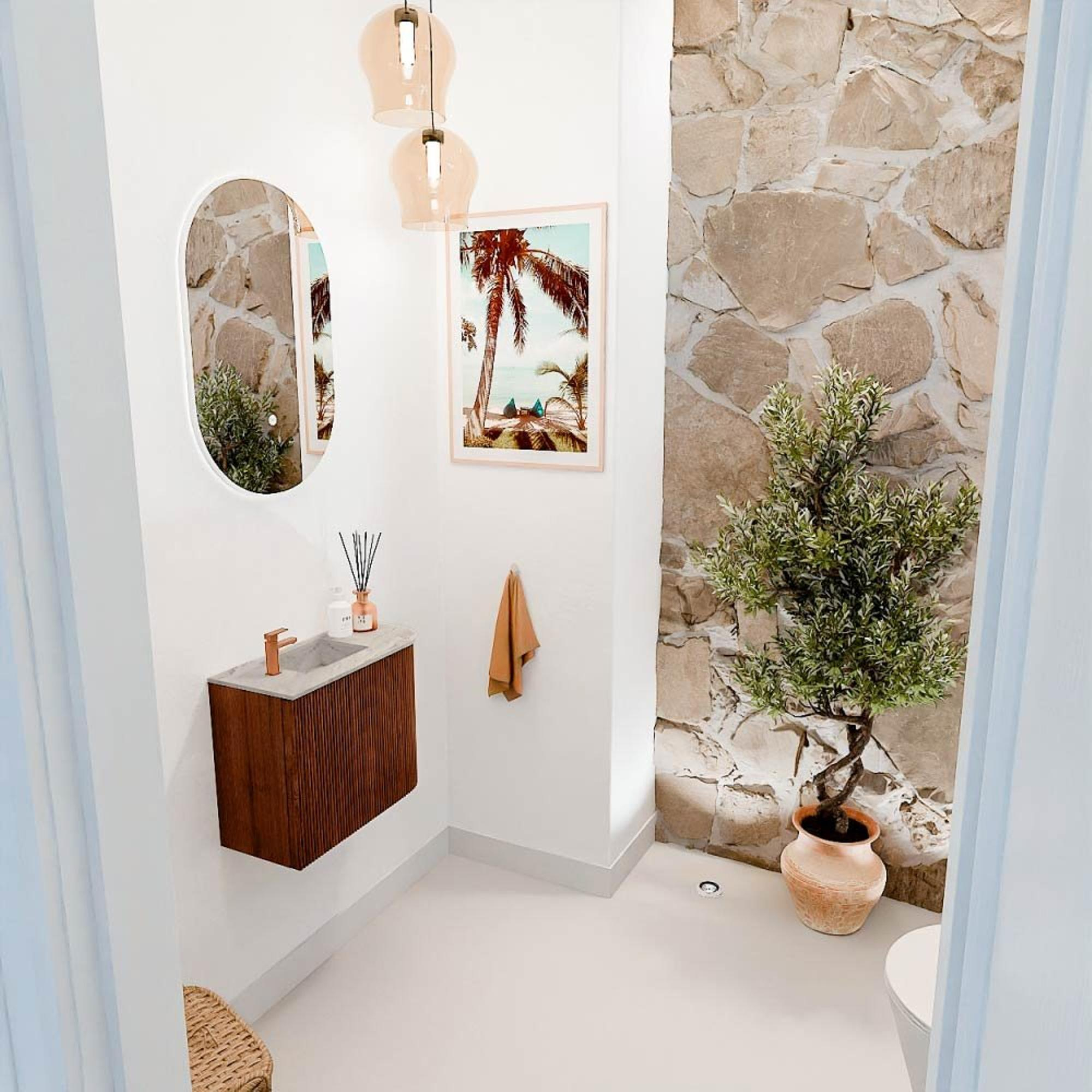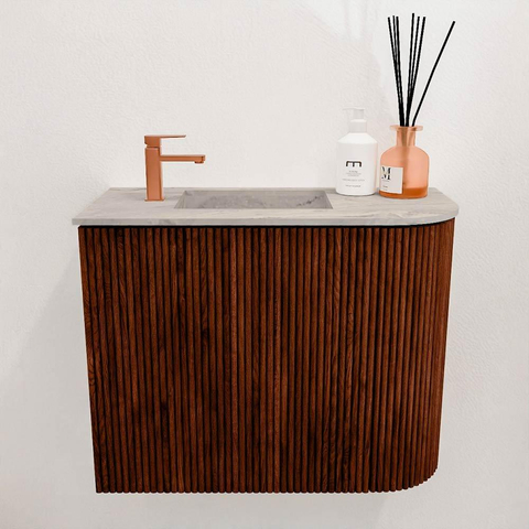 Avec une largeur de 51,6 cm, ce meuble est idéal pour les petites salles de bains ou toilettes d'invités où l'espace est limité. La vasque avec un trou de robinet est pratique et facile à combiner avec différents robinets. La position de la vasque à gauche et l'arrondi du côté droit permettent une utilisation optimale de l'espace disponible. De plus, le meuble offre suffisamment d'espace de rangement pour garder vos accessoires de salle de bains bien rangés, ce qui maintient votre salle de bains toujours ordonnée et claire.