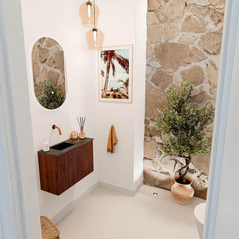 Avec ce meuble élégant, vous donnez immédiatement à votre salle de bains un aspect élégant et moderne. Le design compact le rend parfait pour les petits espaces, comme un WC invité ou une salle de bains compacte, sans compromettre la fonctionnalité. La combinaison de la couleur chaude Ruby et du plan vasque Lava épuré crée un contraste surprenant qui donne à votre salle de bains une atmosphère unique. Grâce à la vasque placée à gauche, vous optimisez l'espace et conservez suffisamment de plan de travail pour vos produits de soin quotidiens. Ce meuble n'est pas seulement un plaisir pour les yeux, mais aussi extrêmement pratique grâce à l'espace de rangement intelligent qui garde votre salle de bains propre et ordonnée. Ainsi, vous profitez chaque jour d'un environnement rangé et chaleureux où vous commencez votre routine matinale avec plaisir.