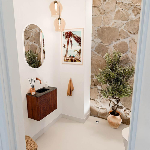 Avec ce meuble compact et élégant, vous donnez immédiatement à votre salle de bains ou toilette d'invités une allure luxueuse. Le meuble est parfait pour les petits espaces grâce à sa faible profondeur de 24,5 cm, ce qui vous permet d'utiliser chaque centimètre de manière optimale. La couleur chaude Ruby combinée au plan vasque couleur lava crée un ensemble chaleureux qui invite à la détente. Grâce à la position centrale de la vasque sans trou de robinet, vous choisissez vous-même le robinet qui correspond le mieux à votre style et à vos souhaits. Ce meuble transforme votre espace en un lieu moderne et fonctionnel où vous commencez et terminez chaque jour avec plaisir.