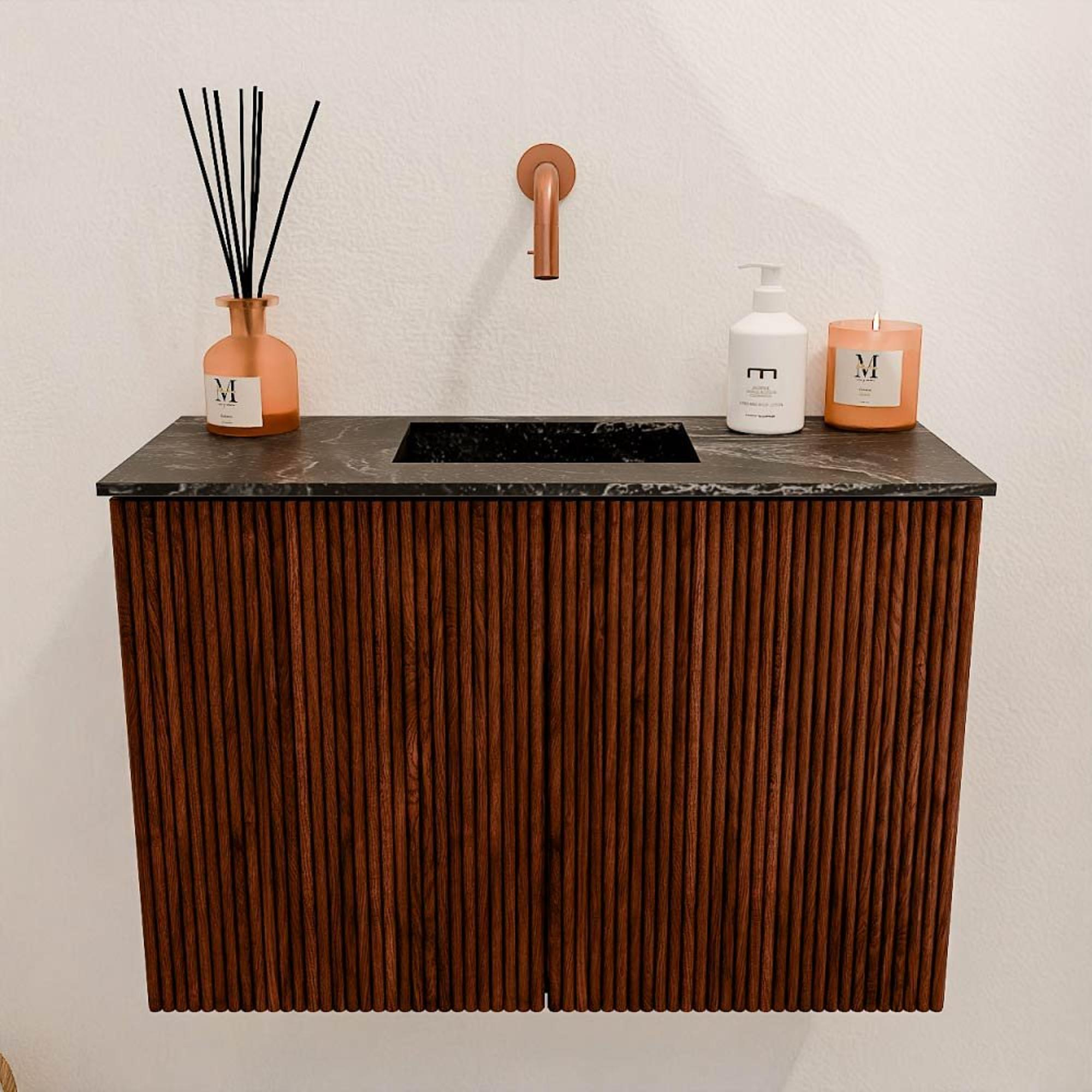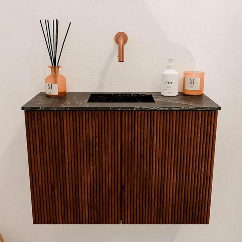 La combinaison de la couleur chaude Ruby avec le chêne naturel fait de ce meuble une pièce maîtresse élégante dans votre salle de bains. Les rainures verticales dans le bois apportent un détail subtil mais distinctif qui attire l'attention sans dominer. Ce meuble s'intègre facilement dans les salles de bains modernes comme classiques et ajoute une sensation de calme et d'élégance. Grâce au design intemporel, vous profiterez pendant des années d'une salle de bains soignée et accueillante.