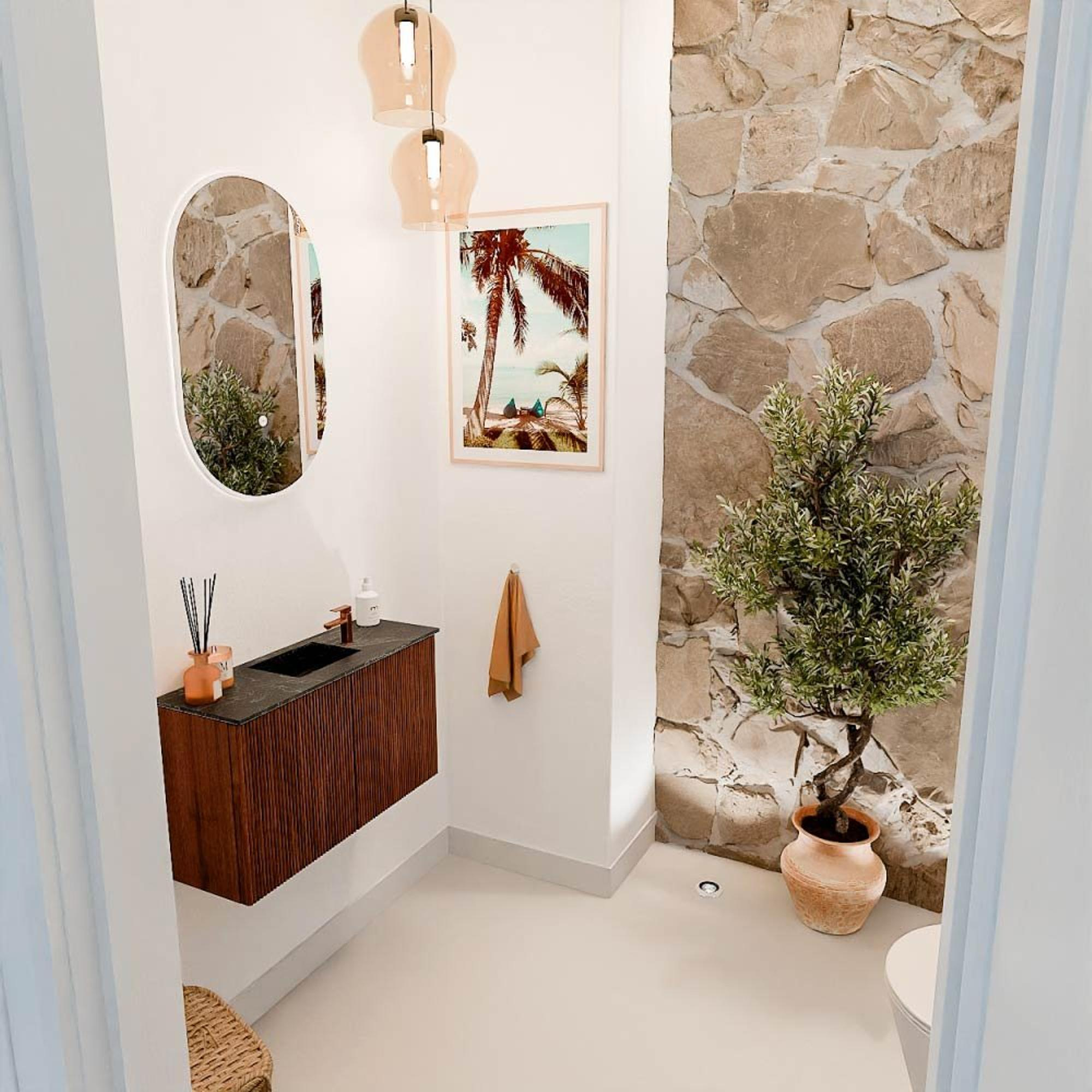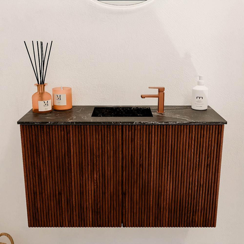 La combinaison de façades en chêne massif avec des côtés en placage de chêne confère à ce meuble une apparence naturelle et raffinée. La structure verticale en relief sur les façades ajoute un élément subtilement ludique, donnant au meuble un look unique et contemporain. La couleur chaude Ruby rend l'ensemble particulièrement chaleureux et fait de ce meuble un véritable point focal dans votre salle de bains. Ce design élégant s'adapte facilement à divers styles d'intérieur, du moderne au classique, et élève l'apparence de votre salle de bains à un niveau supérieur.