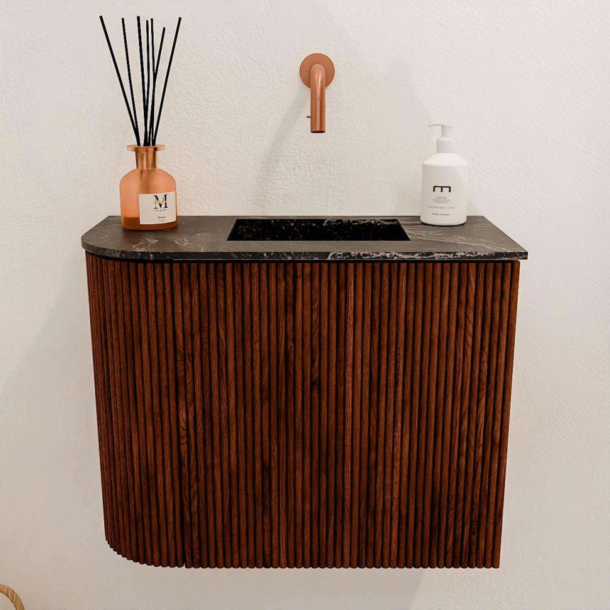 Transformez votre salle de bains avec ce magnifique meuble qui n'est pas seulement fonctionnel, mais ajoute aussi une ambiance chaleureuse et élégante. Grâce à son design intelligent avec un arrondi subtil sur le côté gauche, le meuble s'intègre parfaitement dans diverses configurations de salle de bains, tandis que la couleur Ruby profonde et riche attire immédiatement le regard. La combinaison avec la vasque Faye couleur Lava, sans trou de robinet, vous donne la liberté de choisir vous-même le robinet parfait qui correspond à votre style et à vos souhaits. Ce meuble offre non seulement une belle apparence, mais aussi un espace de rangement pratique, ce qui permet à votre salle de bains de rester toujours propre et soignée. Les matériaux de haute qualité et la finition soignée garantissent que vous profiterez de ce meuble intemporel pendant de nombreuses années.