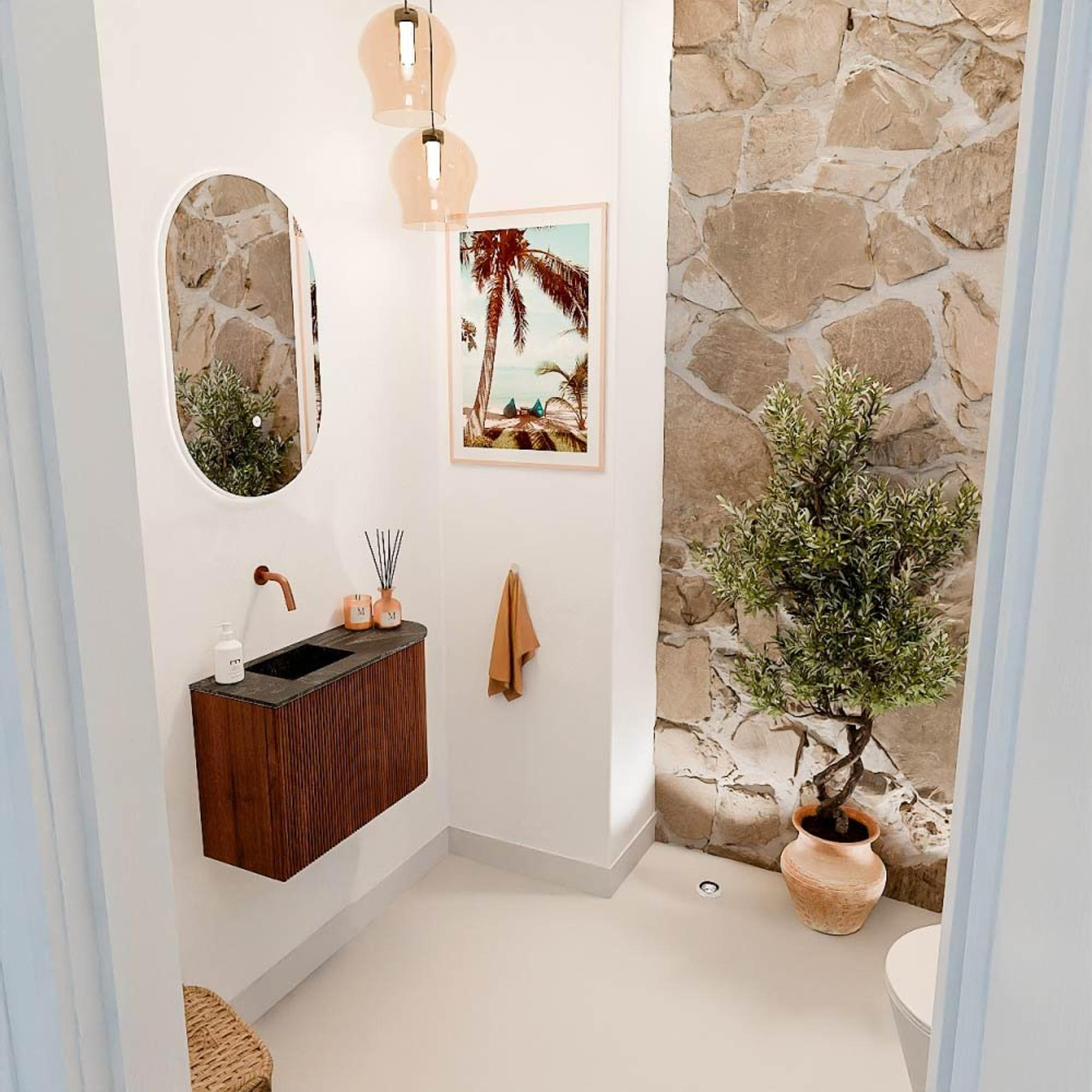 Le meuble se distingue immédiatement par sa finition raffinée et la couleur ruby chaude qui procure une sensation de luxe. Les rainures verticales dans le bois créent un jeu de lignes ludique mais calme, parfaitement adapté aux salles de bains modernes et classiques. L'arrondi sur le côté droit rend le design unique et fait du meuble non seulement un élément fonctionnel, mais aussi un véritable point focal. Ainsi, vous créez facilement une salle de bains impressionnante, sans que cela soit trop ostentatoire.