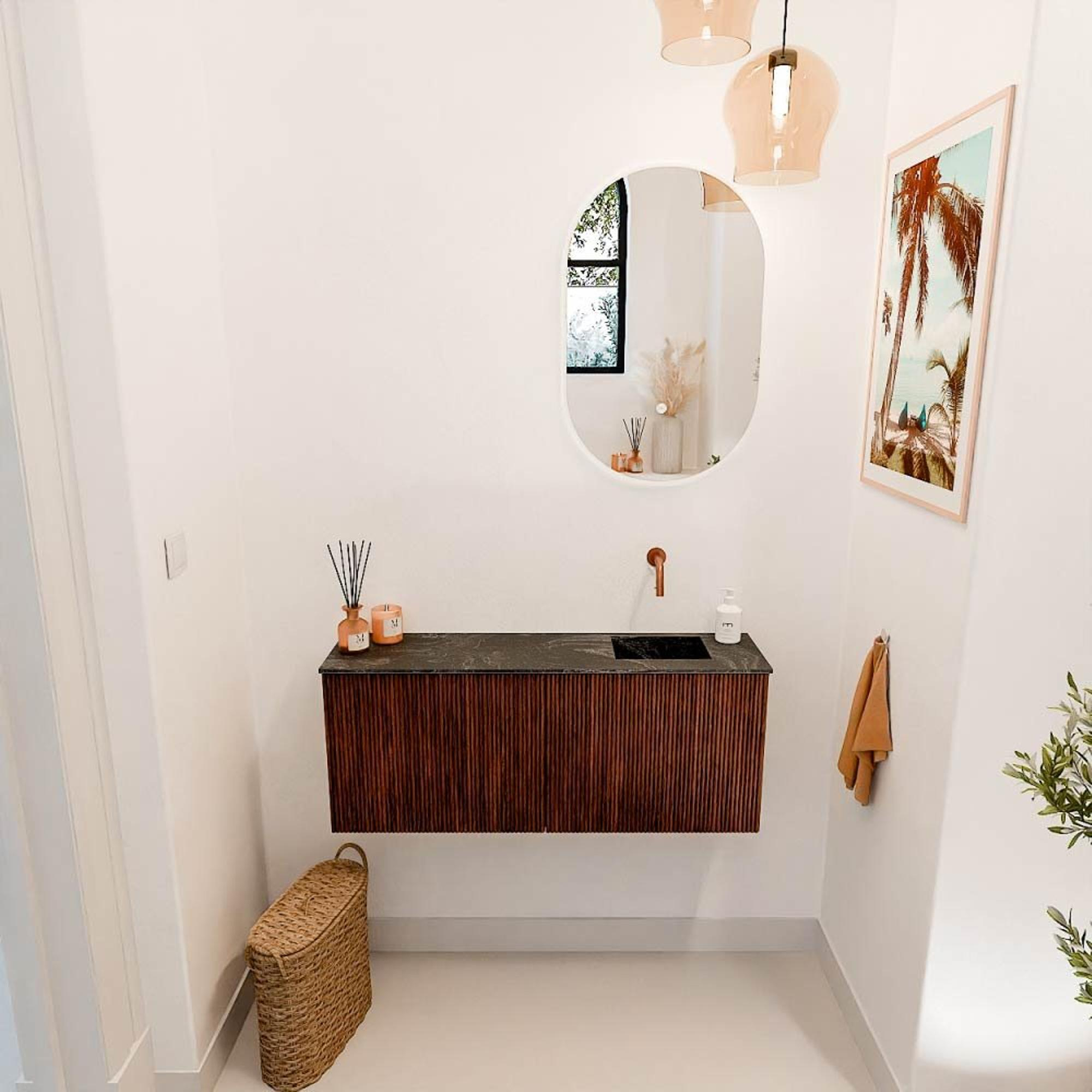 Transformez votre espace toilette avec ce magnifique meuble qui non seulement est élégant, mais aussi étonnamment pratique. Grâce à son design compact avec une profondeur de seulement 24,5 cm, il s'intègre facilement dans les petits espaces sans sacrifier le rangement. La couleur chaude Ruby combinée aux rainures verticales subtiles donne au meuble une apparence intemporelle qui apporte immédiatement une ambiance luxueuse et accueillante à votre salle de bains. La vasque fournie en couleur Lava, positionnée à droite, ajoute une touche moderne sans trou de robinet, vous permettant de choisir vous-même le robinet qui correspond le mieux à votre style et à vos besoins. Ce meuble est conçu pour faciliter votre routine quotidienne tout en offrant une apparence raffinée qui complète parfaitement votre espace toilette.
