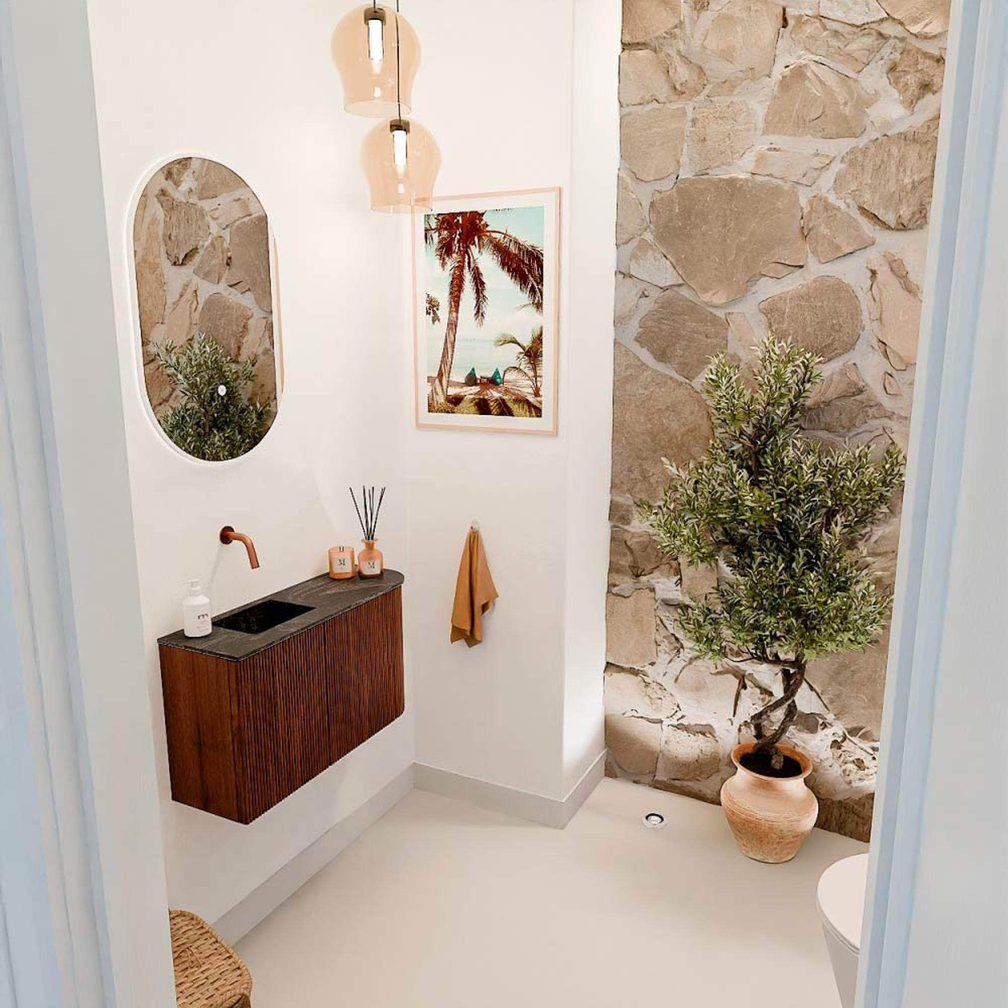La couleur Ruby frappante du meuble donne immédiatement à vos toilettes un aspect frais et moderne. Le côté droit arrondi offre une forme douce et accueillante qui diffère des meubles rectangulaires standards. Cela fait du meuble non seulement un point focal, mais aussi un ajout élégant qui s'harmonise parfaitement avec divers styles d'intérieur. Le lavabo Lava avec cuvette placée à gauche sans trou de robinet offre un look épuré et minimaliste qui dégage calme et espace. Vous profitez ainsi d'une salle de bains à la fois fonctionnelle et visuellement attrayante.
