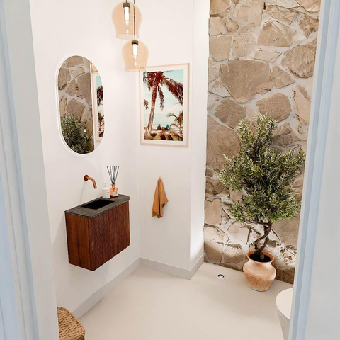 Avec ce magnifique meuble, vous donnez à vos toilettes un aspect élégant et chaleureux qui attire immédiatement l’attention. Le format compact de juste un peu plus de 50 centimètres de large le rend idéal pour les petits espaces, sans compromettre la fonctionnalité. L’arrondi subtil sur le côté droit ajoute une touche ludique et moderne, tandis que la riche couleur Ruby apporte chaleur et caractère. Le lavabo assorti en couleur Lava sans trou de robinet offre un look épuré et minimaliste qui se combine facilement avec divers robinets et accessoires. Ainsi, vous créez un ensemble harmonieux où chaque détail est parfait. Ce meuble n’est pas seulement un plaisir pour les yeux, mais aussi pratique grâce à son agencement intelligent et à l’utilisation de matériaux de haute qualité qui durent longtemps. Vous profitez ainsi chaque jour d’un espace toilettes propre et soigné qui ressemble à un petit refuge de luxe.