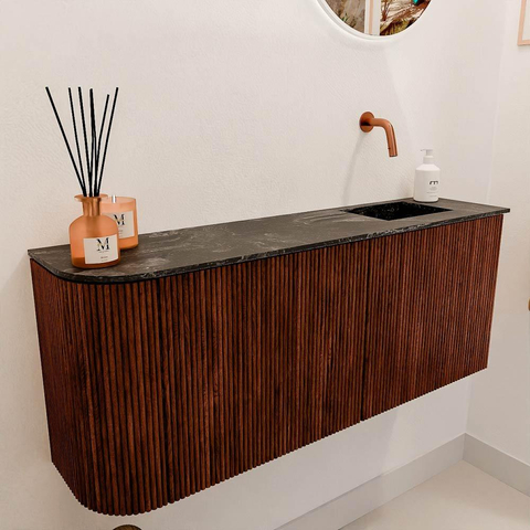 Le meuble est conçu avec un souci du détail et une finition raffinée. La couleur chaude Ruby donne une apparence luxueuse qui améliore immédiatement votre salle de bains. L’arrondi subtil sur le côté gauche rend le meuble unique et apporte une forme douce et accueillante à votre espace. En combinaison avec la vasque couleur Lava, cela crée un ensemble harmonieux à la fois moderne et intemporel. Ce meuble s’intègre parfaitement dans une salle de bains contemporaine où le style et l’ambiance sont au centre.